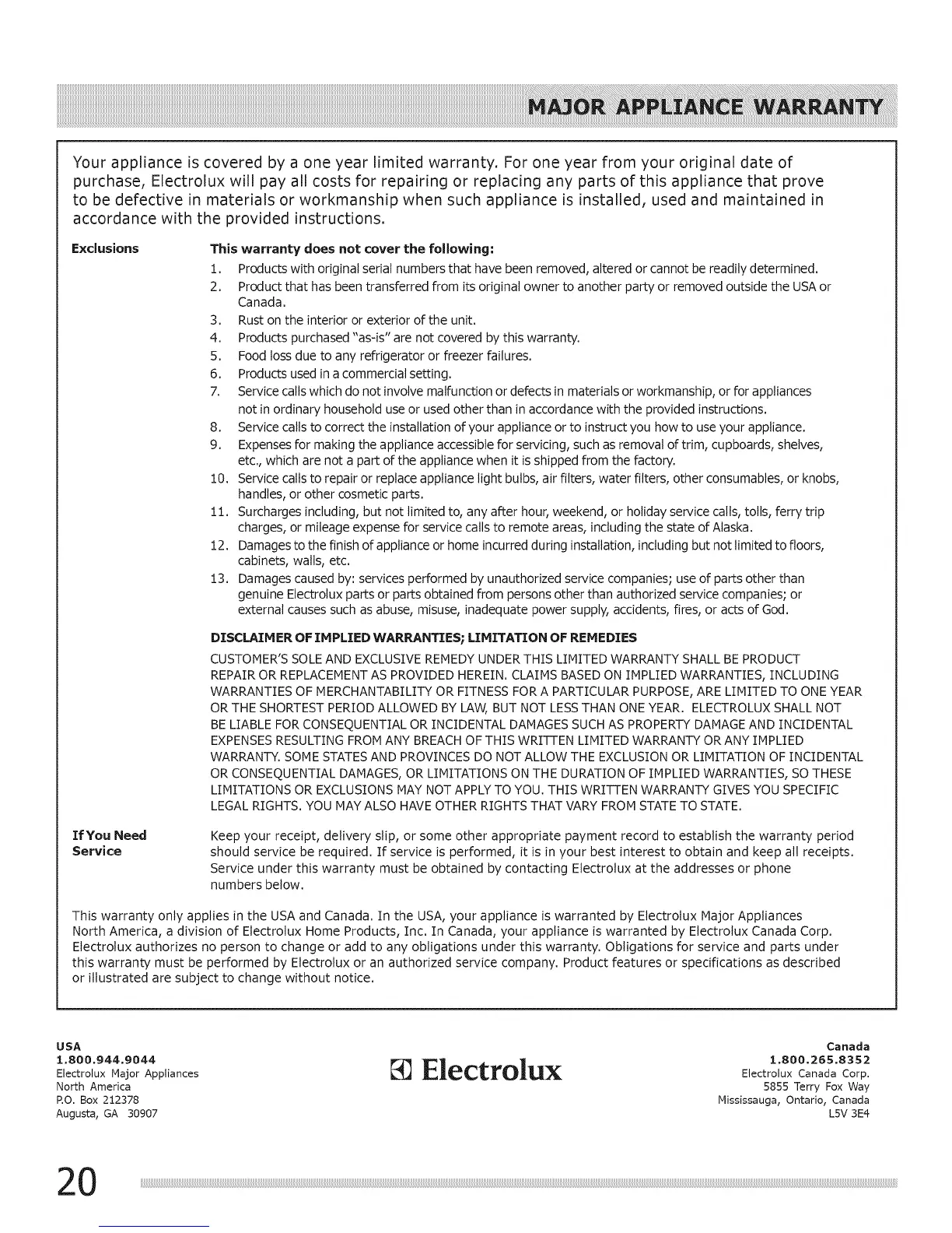 This warranty only applies in the USA and Canada. In the USA,your appliance is warranted by Electrolux Major Appliances