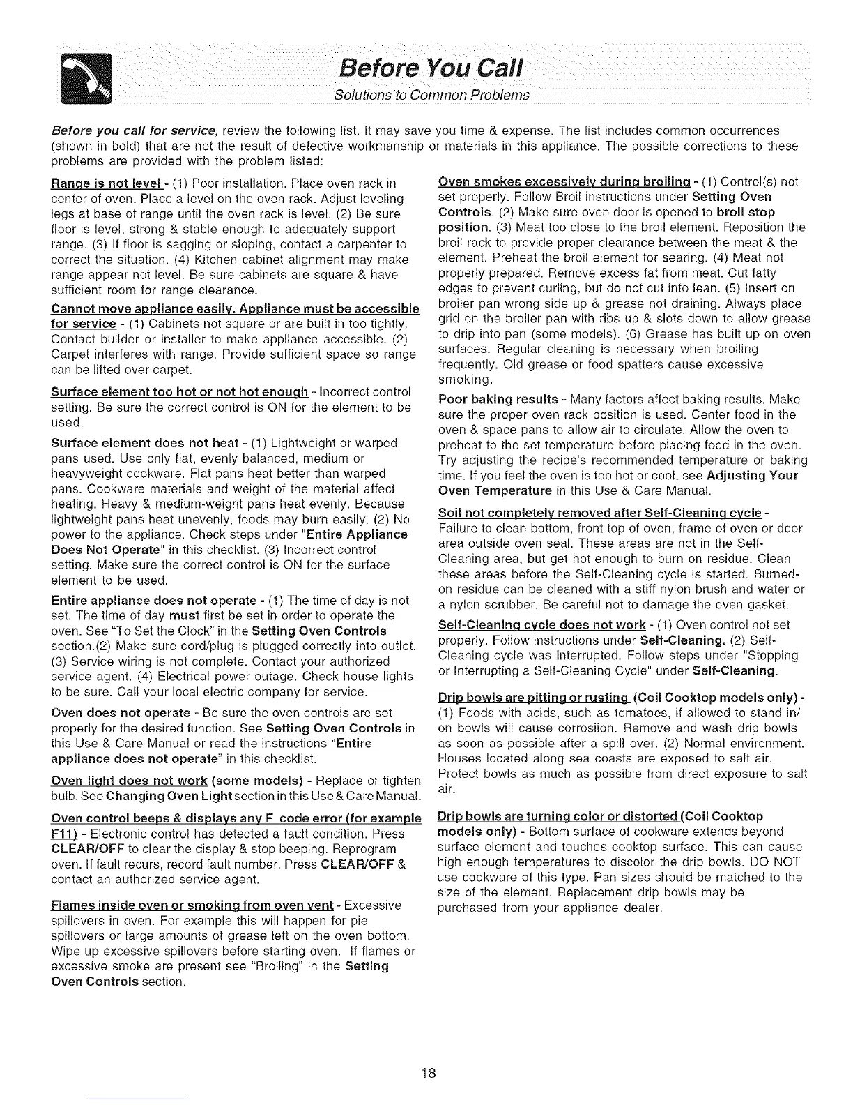 (shown in bold) that are not the result of defective workmanship or materials in this appliance. The possible corrections to these