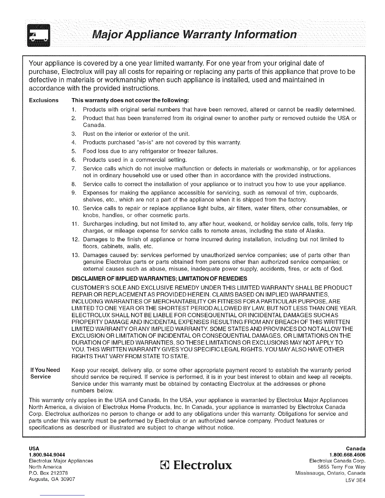 North America, a division of Electrolux Home Products, Inc. In Canada, your appliance is warranted by Electrolux Canada