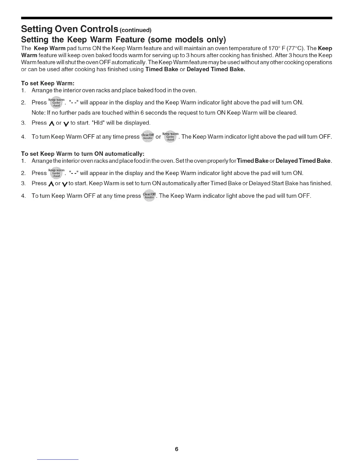 The Keep Warm pad turns ON the Keep Warm feature and will maintain an oven temperature of 170° F (77°C). The Keep