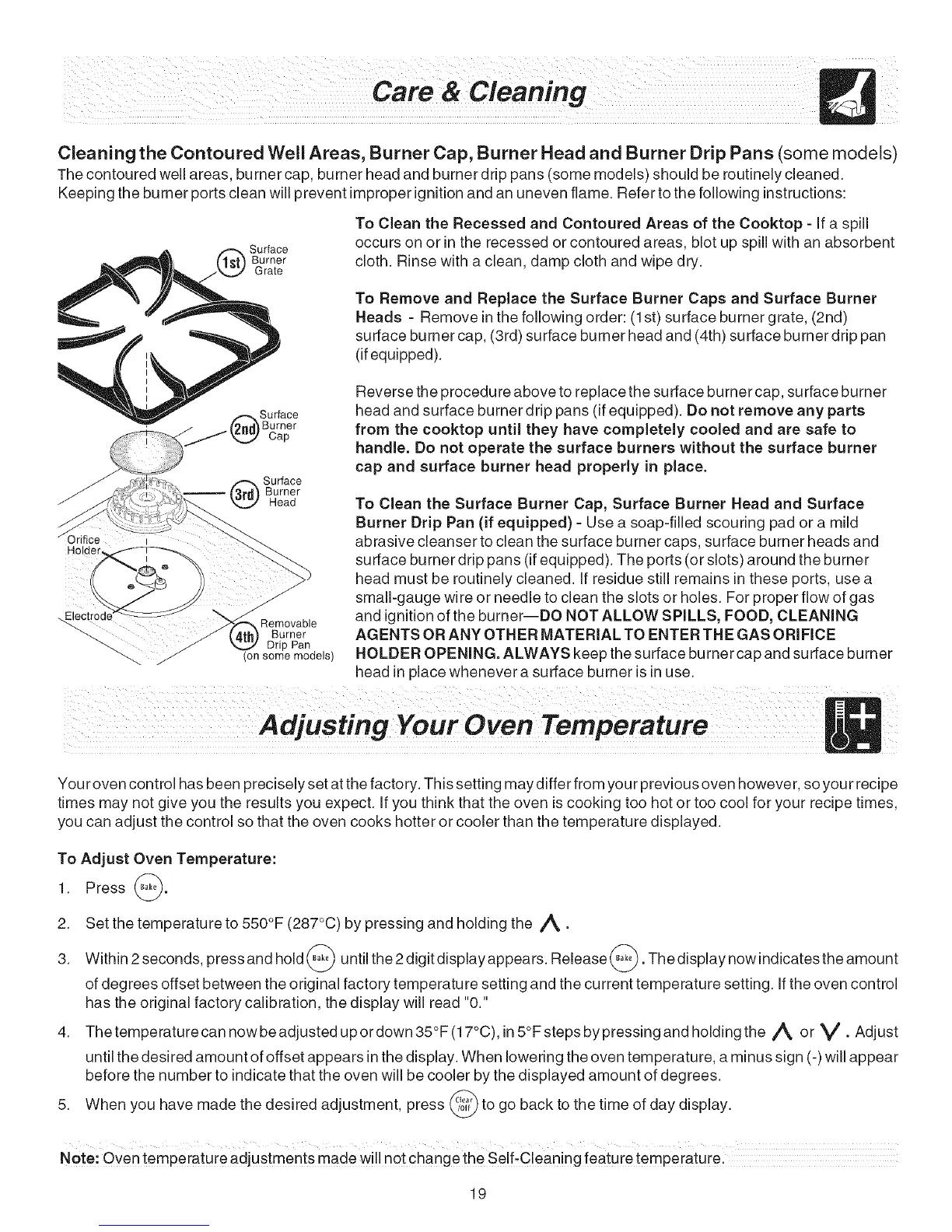 The contoured well areas, burner cap, burner head and burner drip pans (some models) should be routinely cleaned.