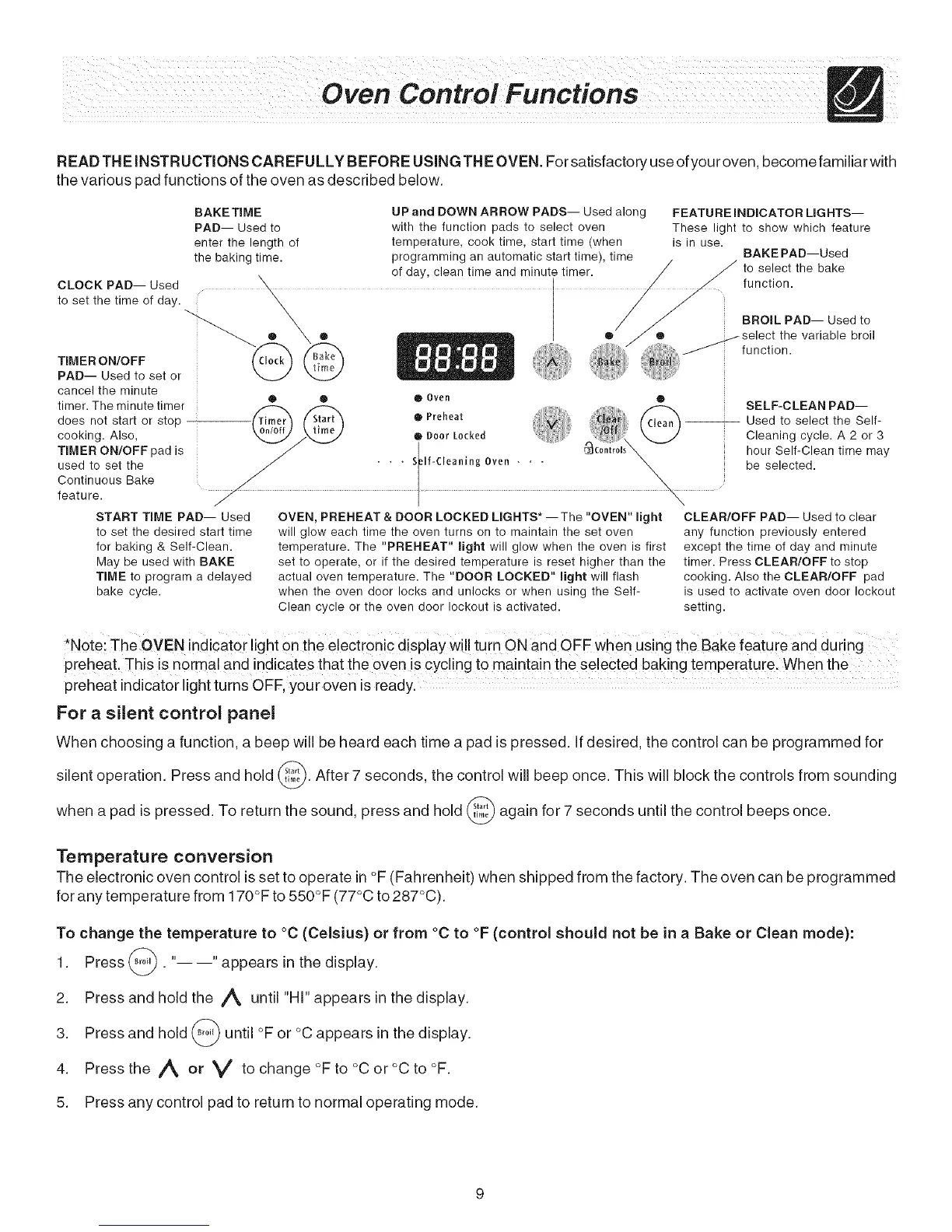 the various pad functions of the oven as described below.
