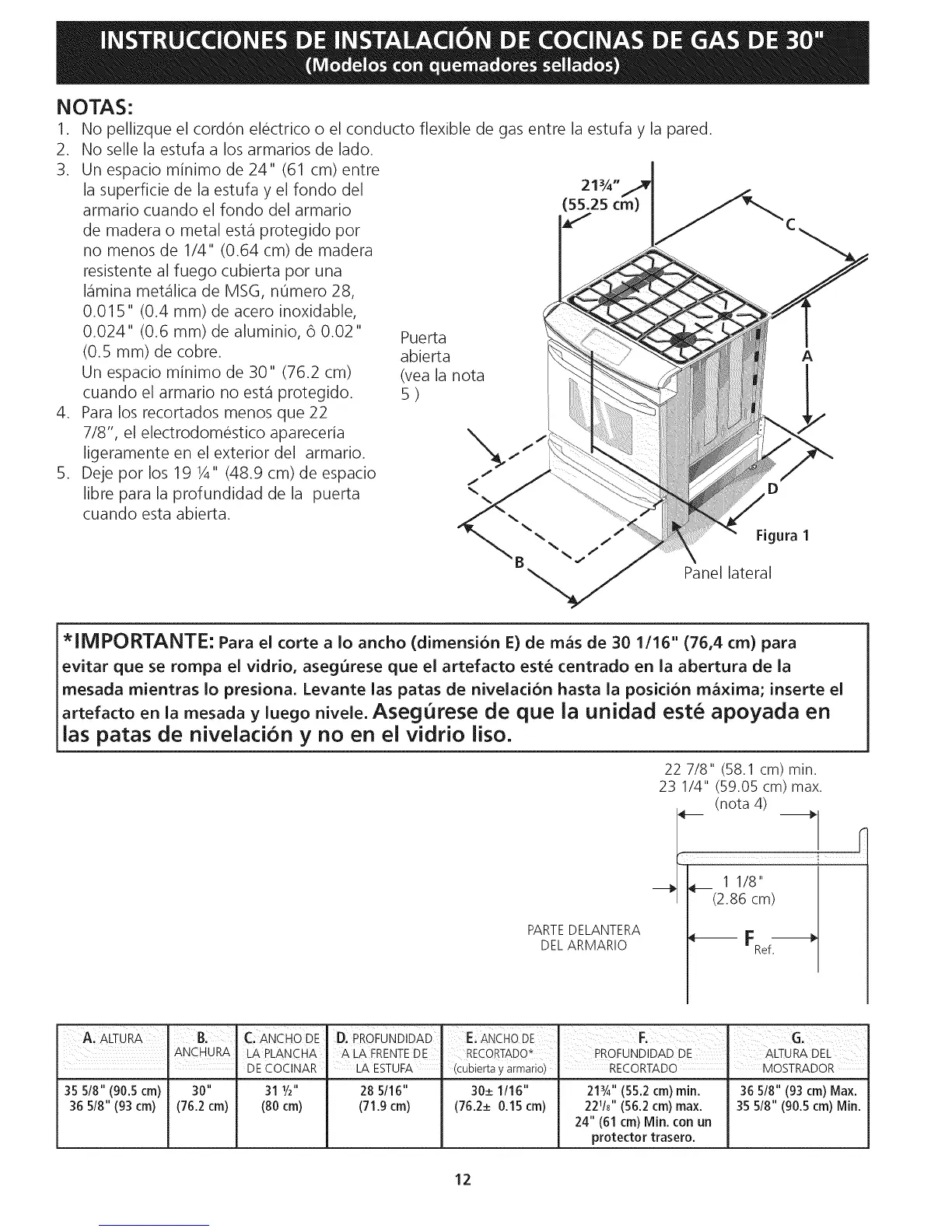 *IMPORTANTE: Para el torte a Io ancho (dimensi6n E) de m_s de 30 1/16" (76,4 cm) para