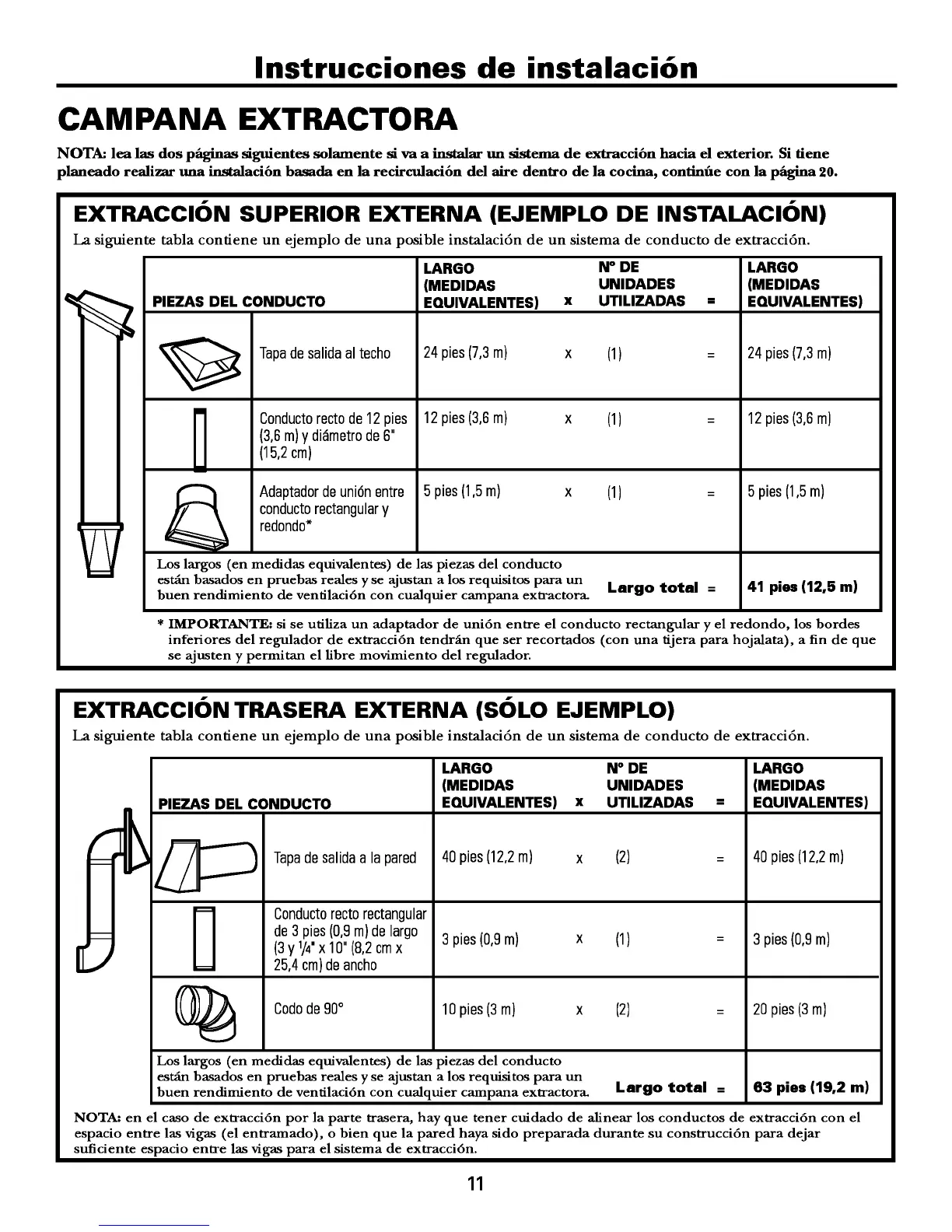 buen rendimiento de ventilaci6n con cualquier campana extractora. Largo total = 41 pies (12,5 m)