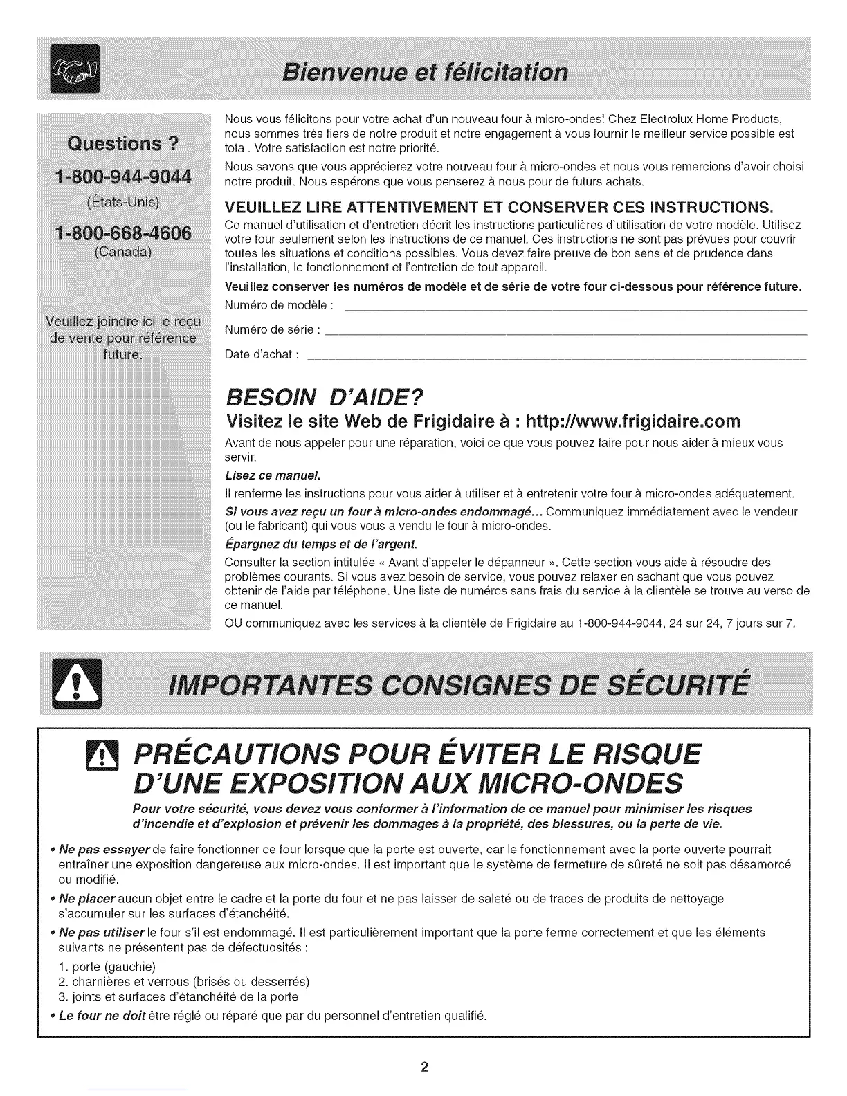 OU communiquez avec les services a.la clientele de Frigidaire au 1-800-944-9044, 24 sur 24, 7 jours sur 7.