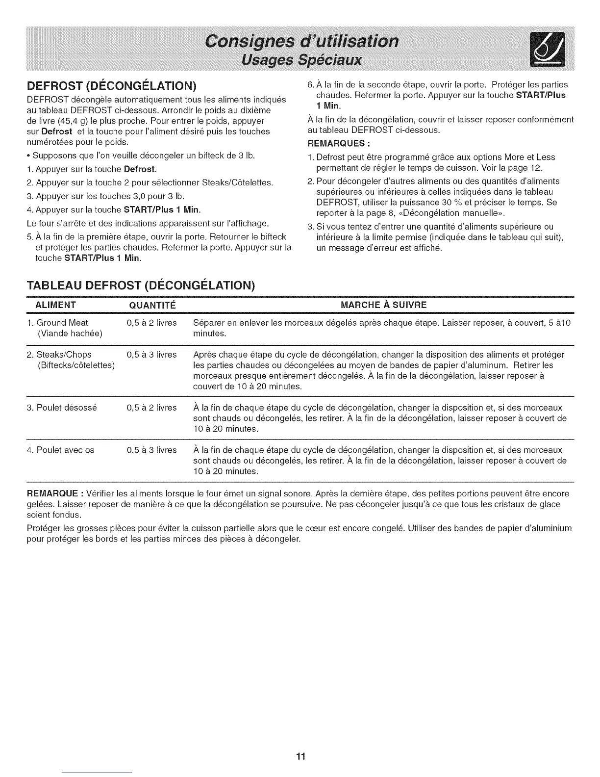 DEFROST, utiliser la puissance 30 % et pr6ciser le temps. Se