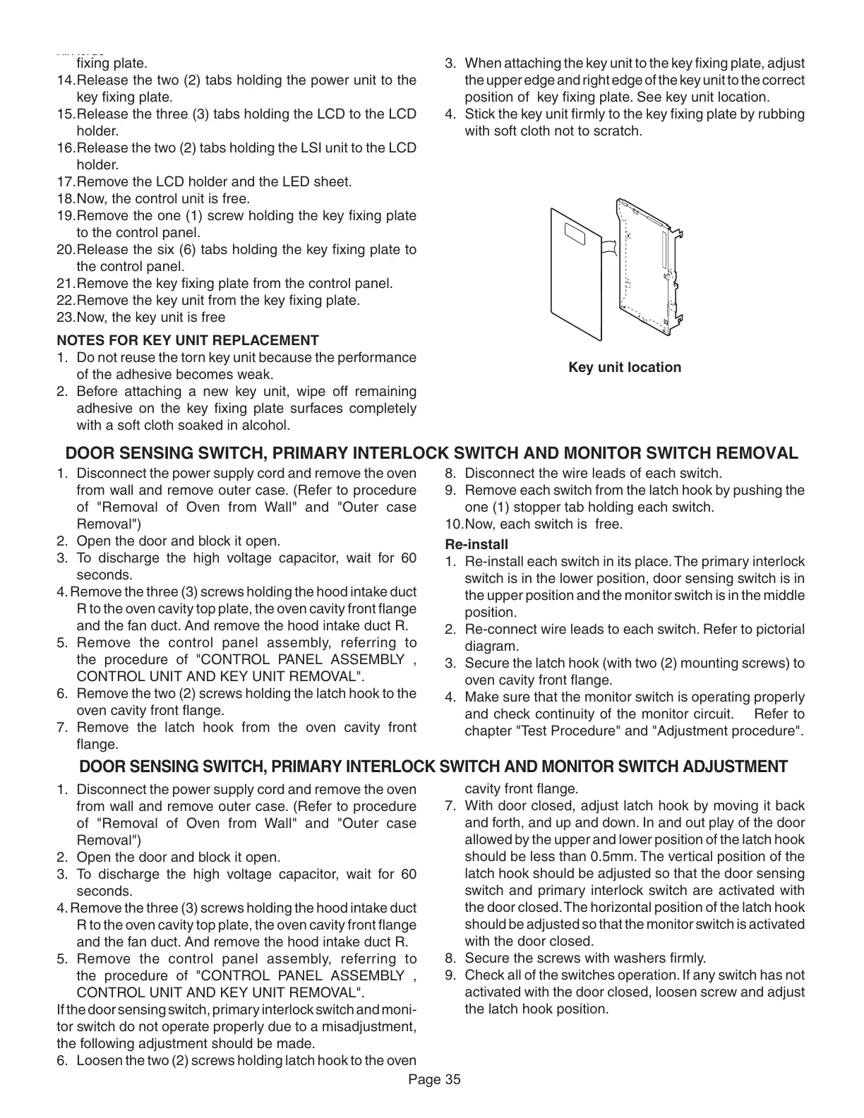 DOOR SENSING SWITCH, PRIMARY INTERLOCK SWITCH AND MONITOR SWITCH ADJUSTMENT