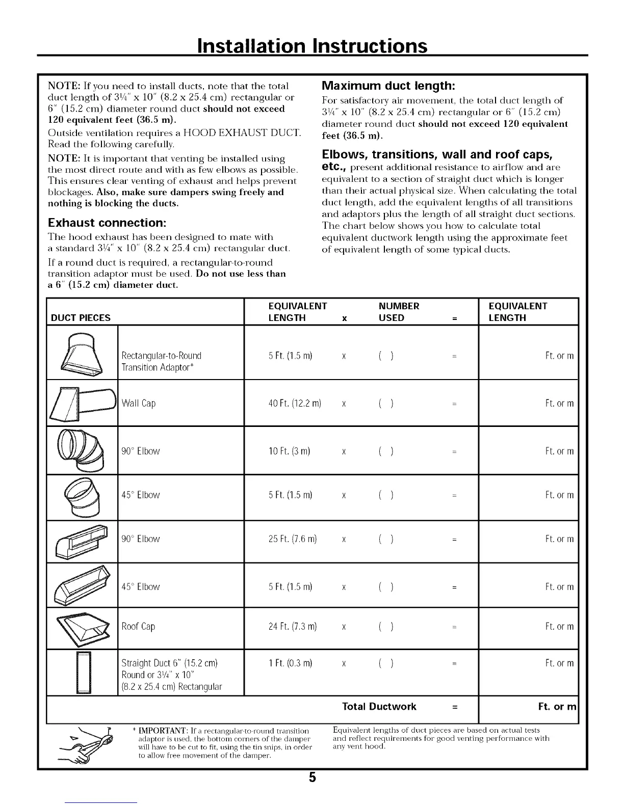 duct length of 31/4" x 10" (8.2 x 25.4 cm) rectangular or
