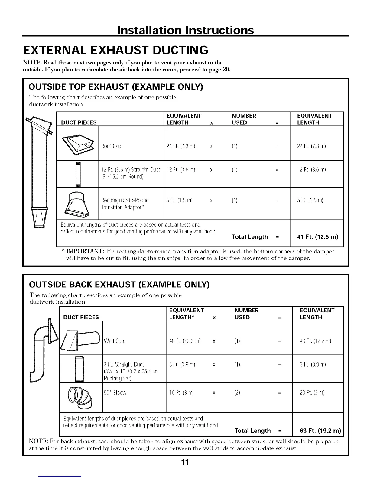 NOTE: For- back exhaust, care should be taken to align exhaust with space between studs, or"wall should be prepared