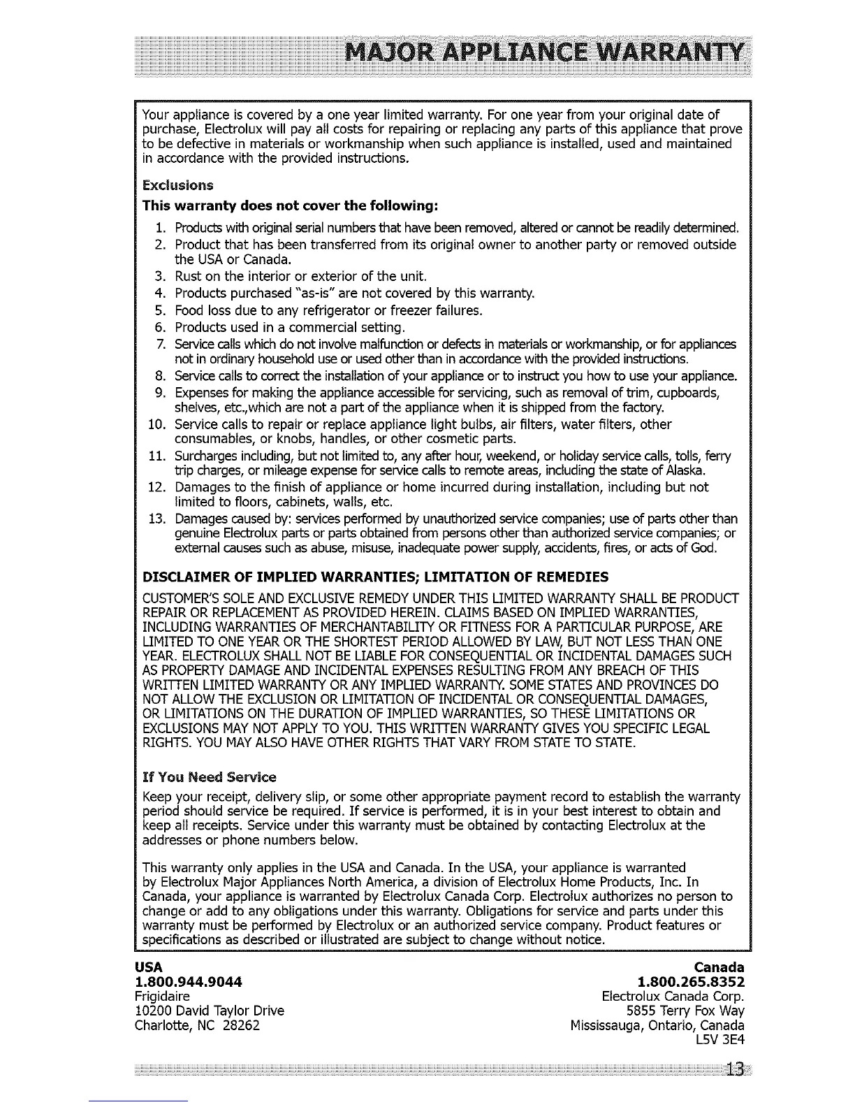 Canada, your appliance is warranted by Electrolux Canada Corp. Electrolux authorizes no person to