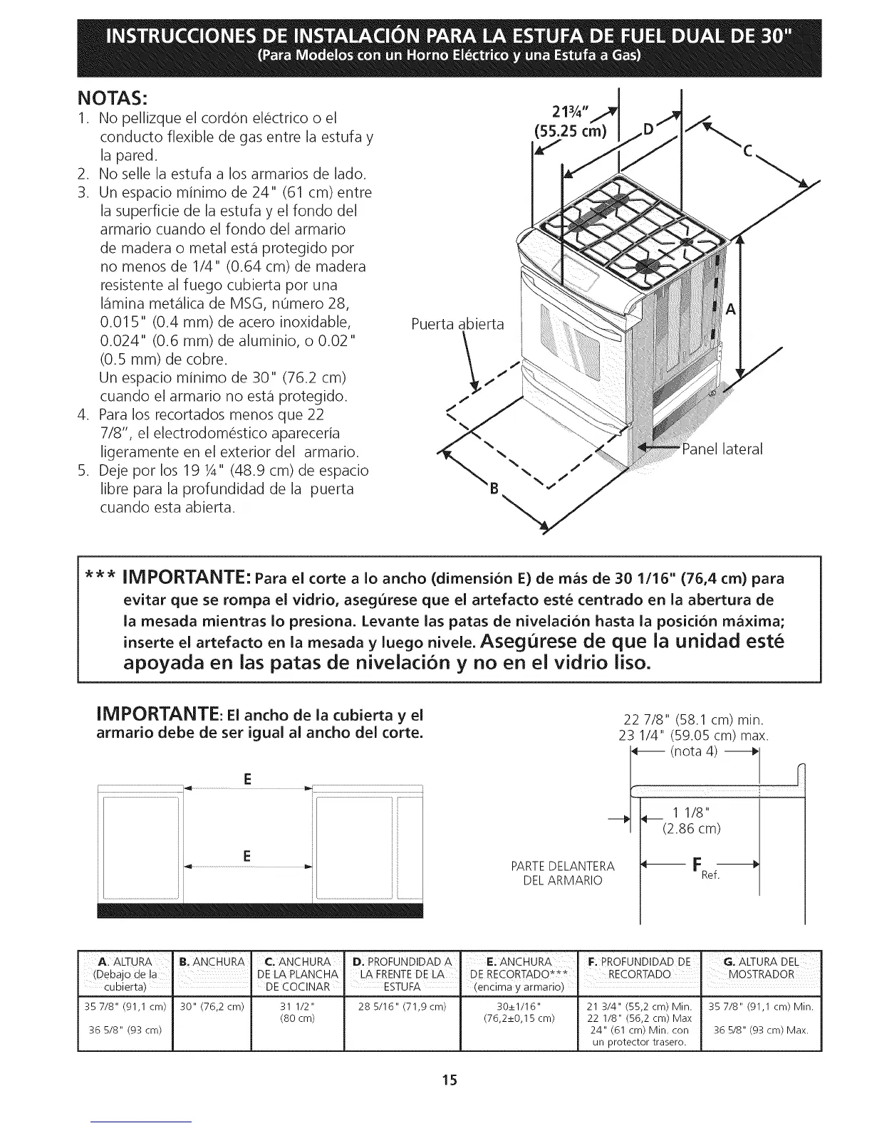 *** IMPORTANTE: Para el corte a Io ancho (dimensi6n E) de m_s de 30 1/16" (76,4 cm) para