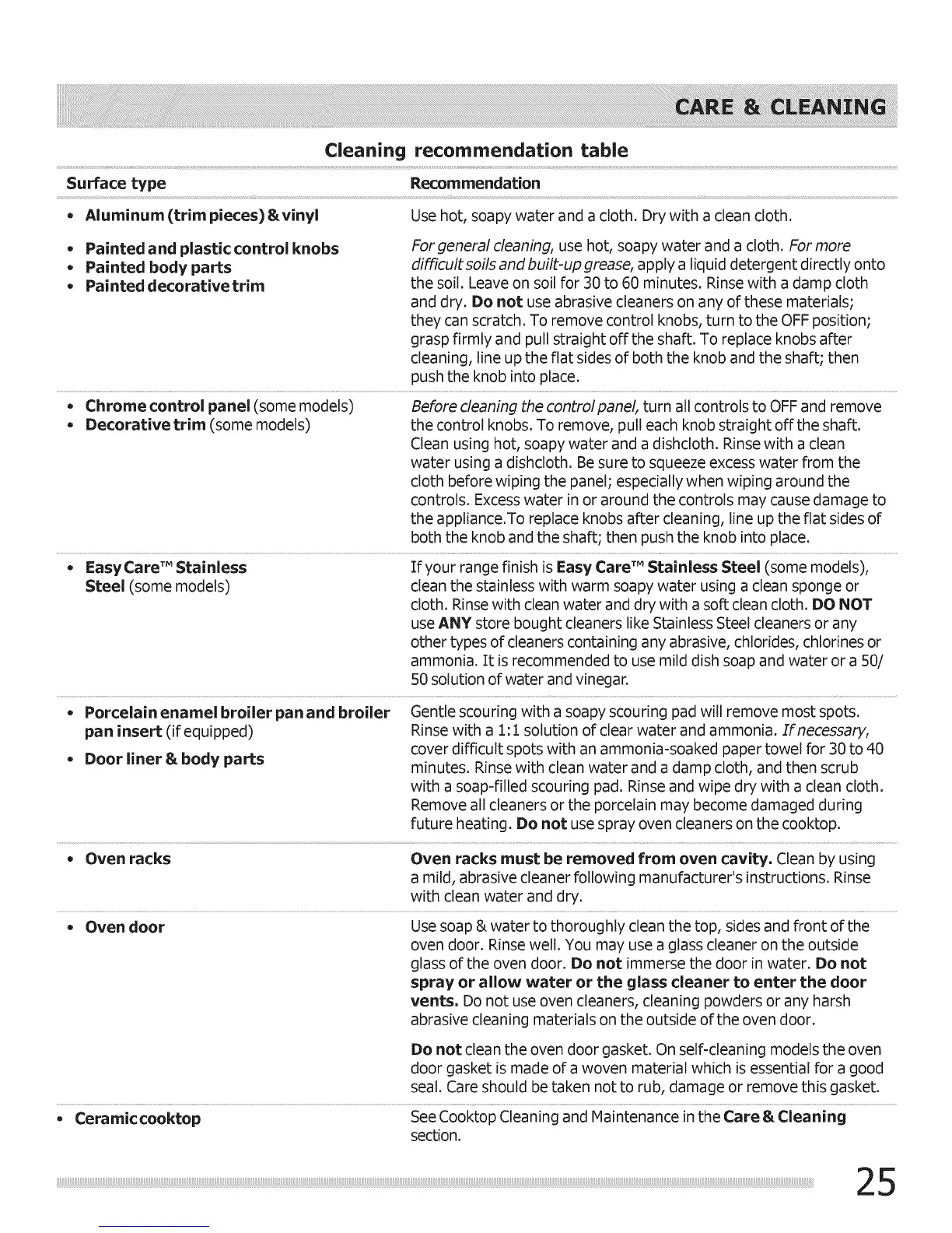 * Painted and plastic control knobs For general cleaning, use hot, soapy water and a cloth. For more