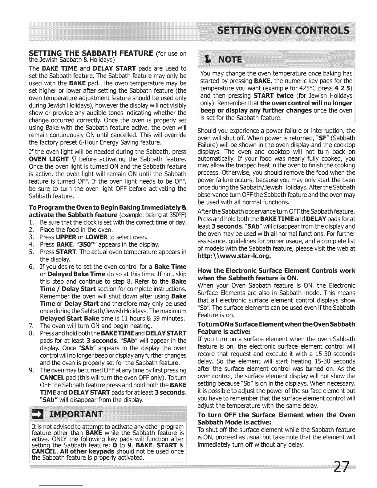 observance turn OFF the Sabbath feature and the oven may