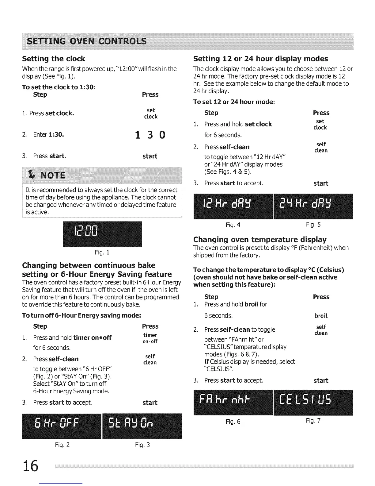 Frigidaire CGEF3055KFD - Setting Oven Controls; Setting the Clock; Changing between Continuous Bake or 6-Hour; Energy Saving Features