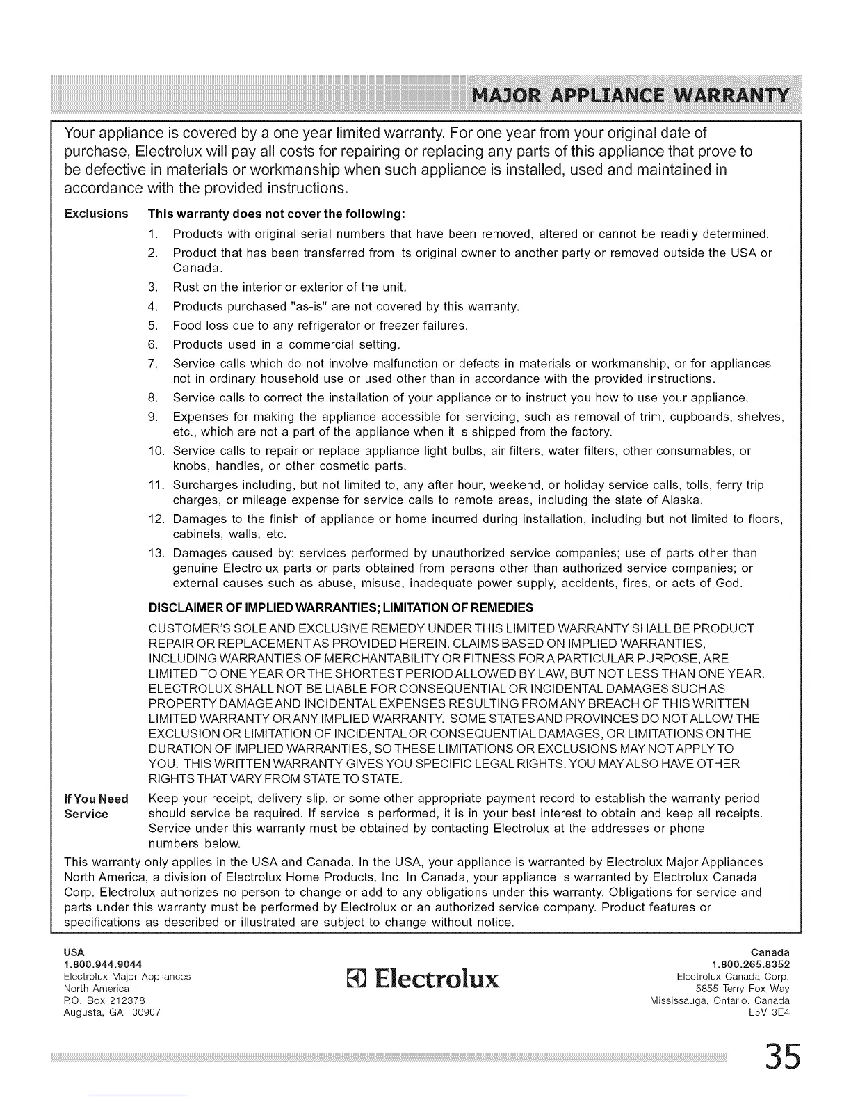 North America, a division of Electrolux Home Products, Inc. In Canada, your appliance is warranted by Electrolux Canada