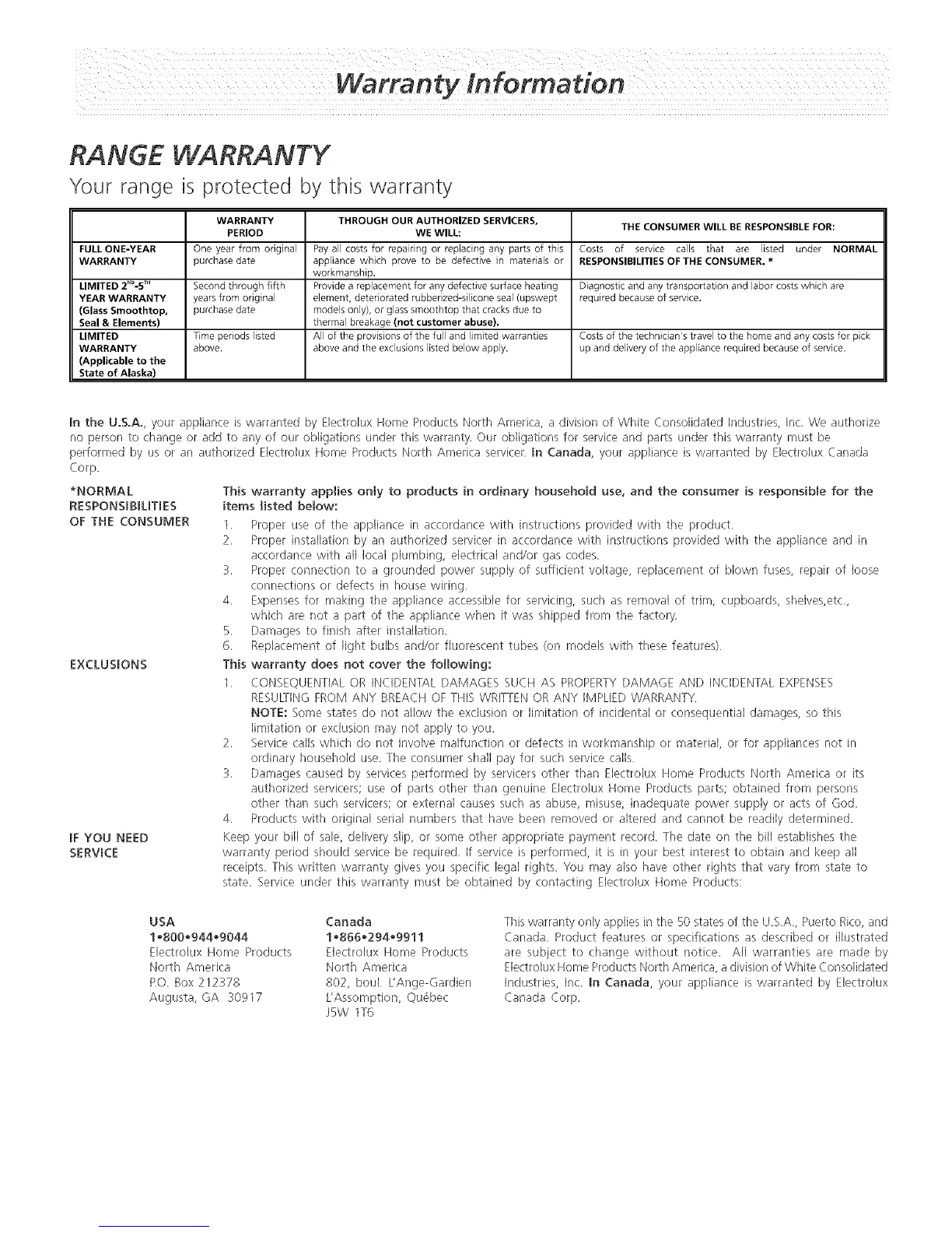 performed by us or an authorized Electrolux Home Products North America servicer. In Canada, your appliance is warranted by Electrolux Canada