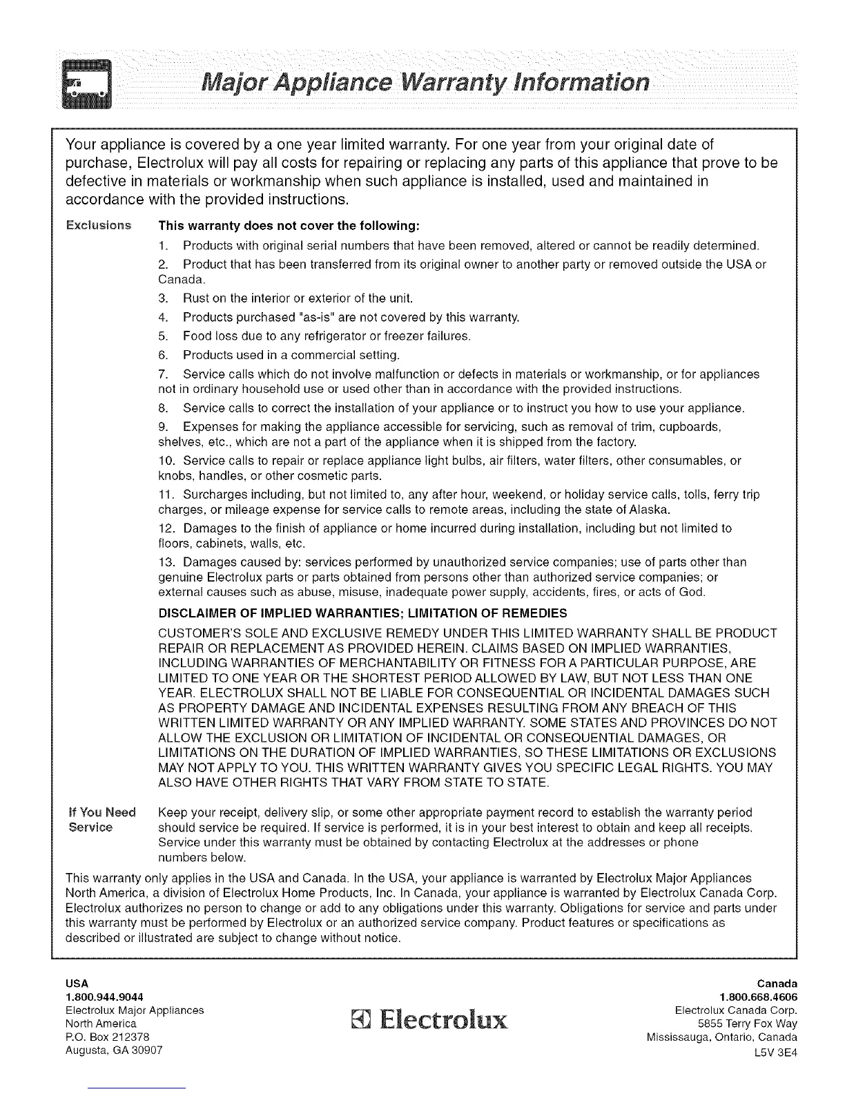Service under this warranty must be obtained by contacting Electrolux at the addresses or phone