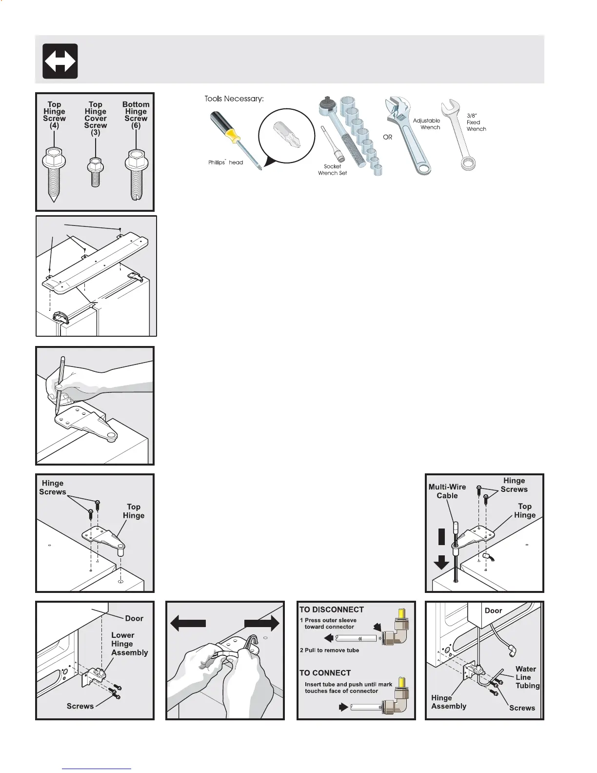 2 Remove the two screws from the top hinge. Lift the door off of the bottom hinge and set it