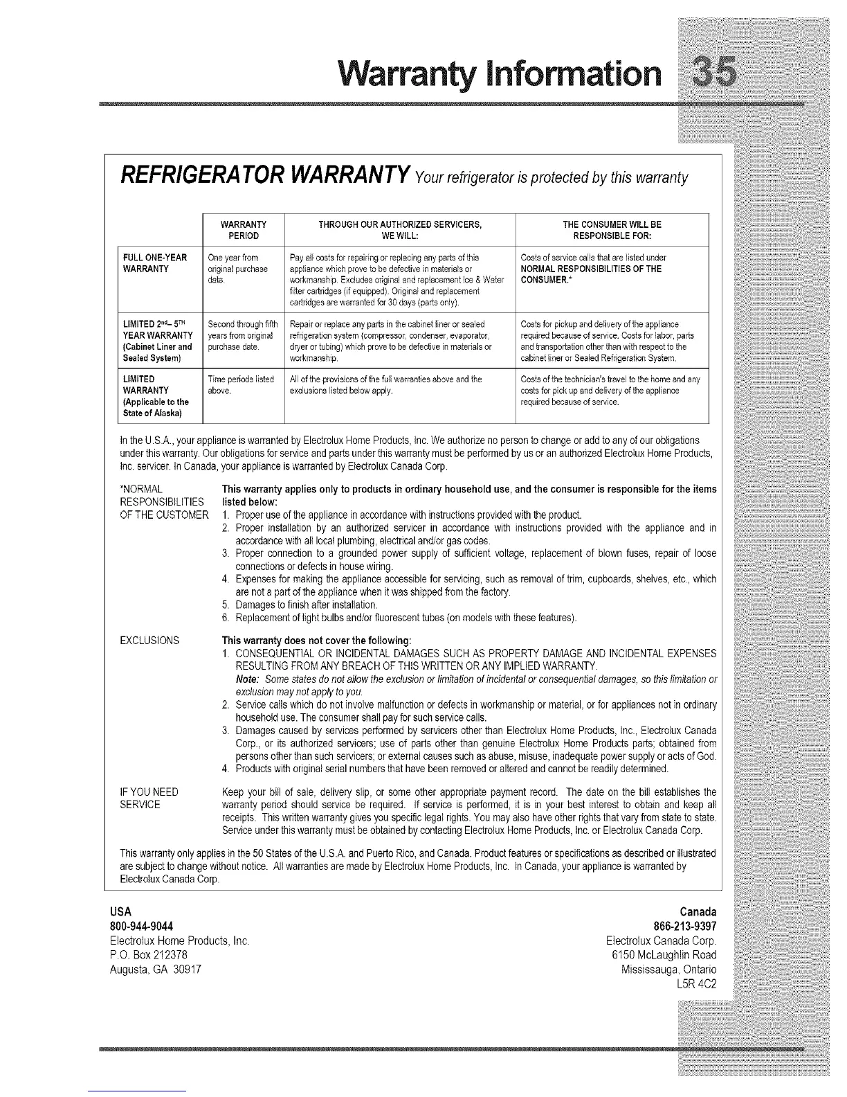 Serviceunderthis warranty mustbeobtainedbycontactingElectroluxHomeProducts,Inc.or ElectroluxCanadaCorp.
