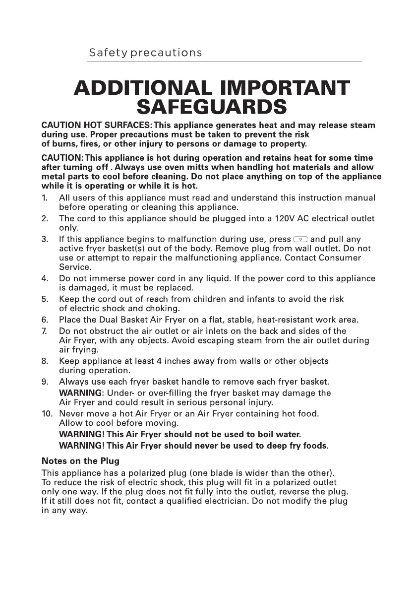 Frigidaire EAF703 - Additional Important Safeguards; Notes on the Plug