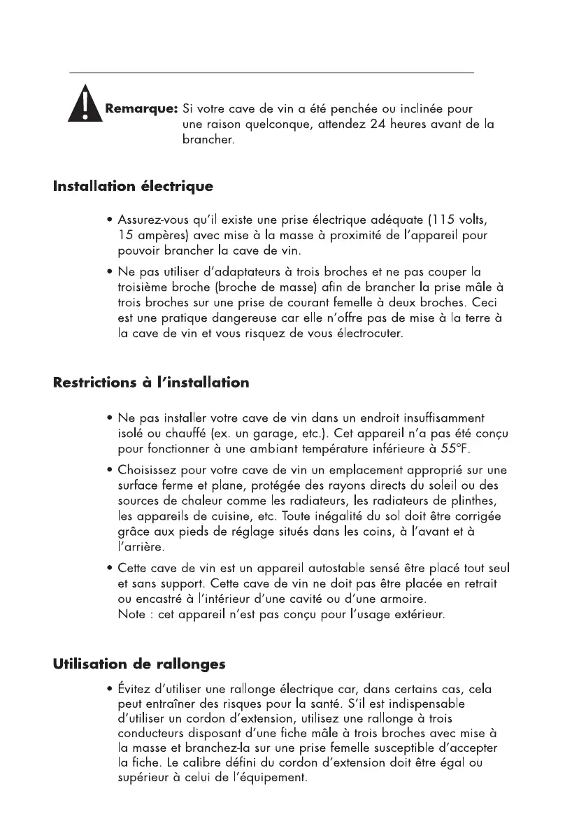 INSTALLATION DE LA VOTRE REFROIDISSEUR DE VIN ET BREUVAGES