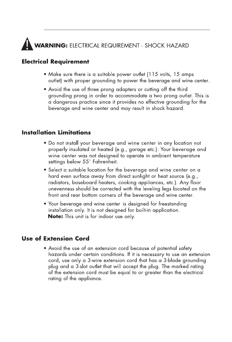 Frigidaire EFMIS164 - Electrical Requirement; Installation Limitations; Use of Extension Cord
