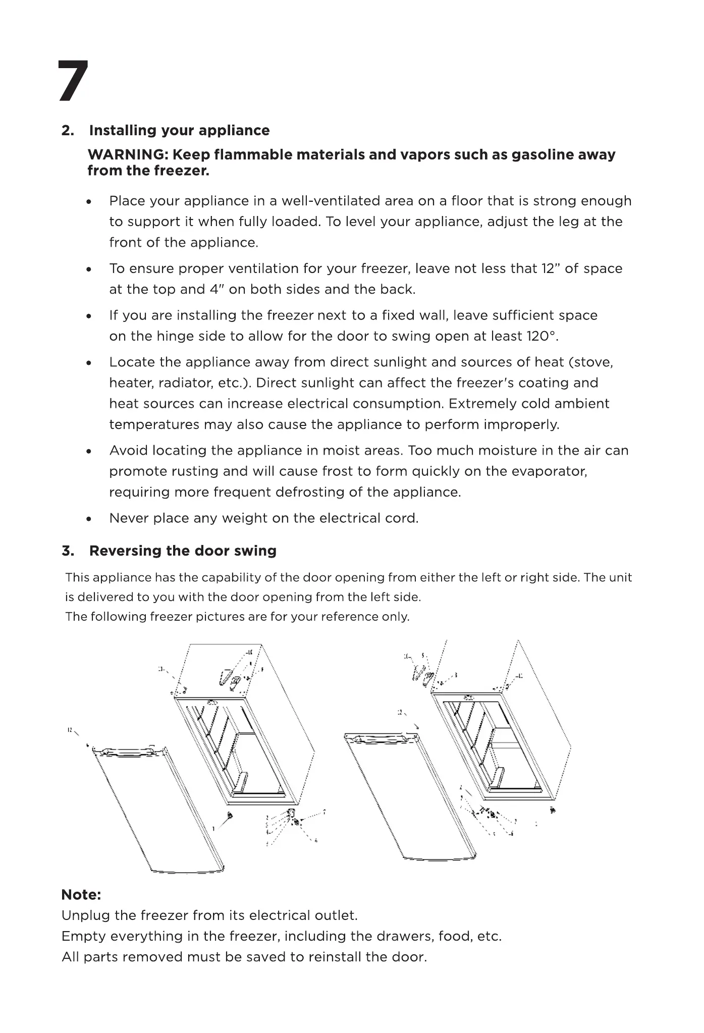 heater, radiator, etc.). Direct sunlight can affect the freezer's coating and