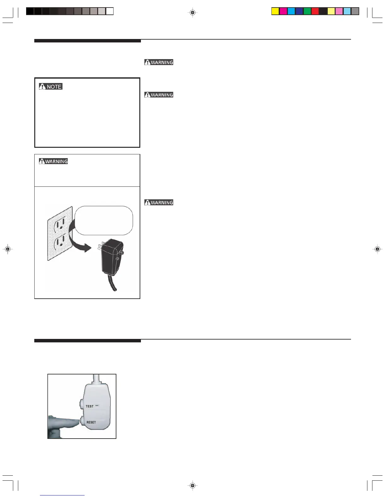 • The power supply cord must be replaced if it fails to reset when either the TEST button is pushed, or