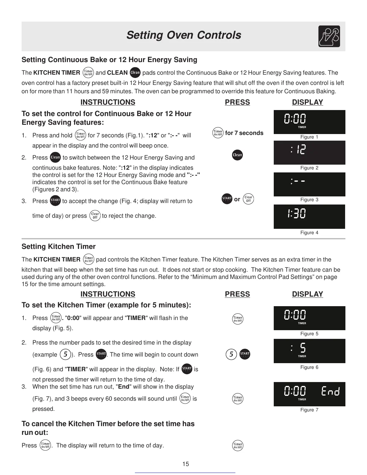 The KITCHEN TIMER and CLEAN pads control the Continuous Bake or 12 Hour Energy Saving features. The