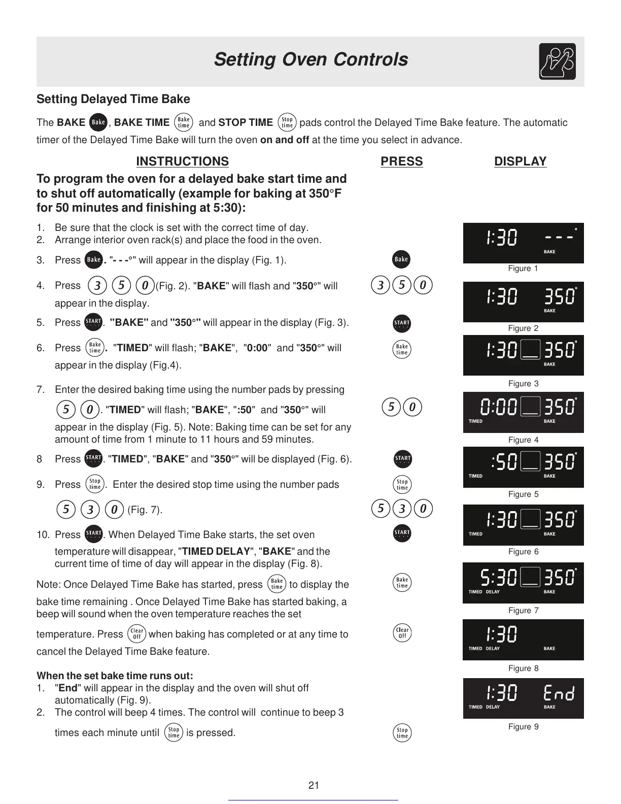 10. Press . When Delayed Time Bake starts, the set oven