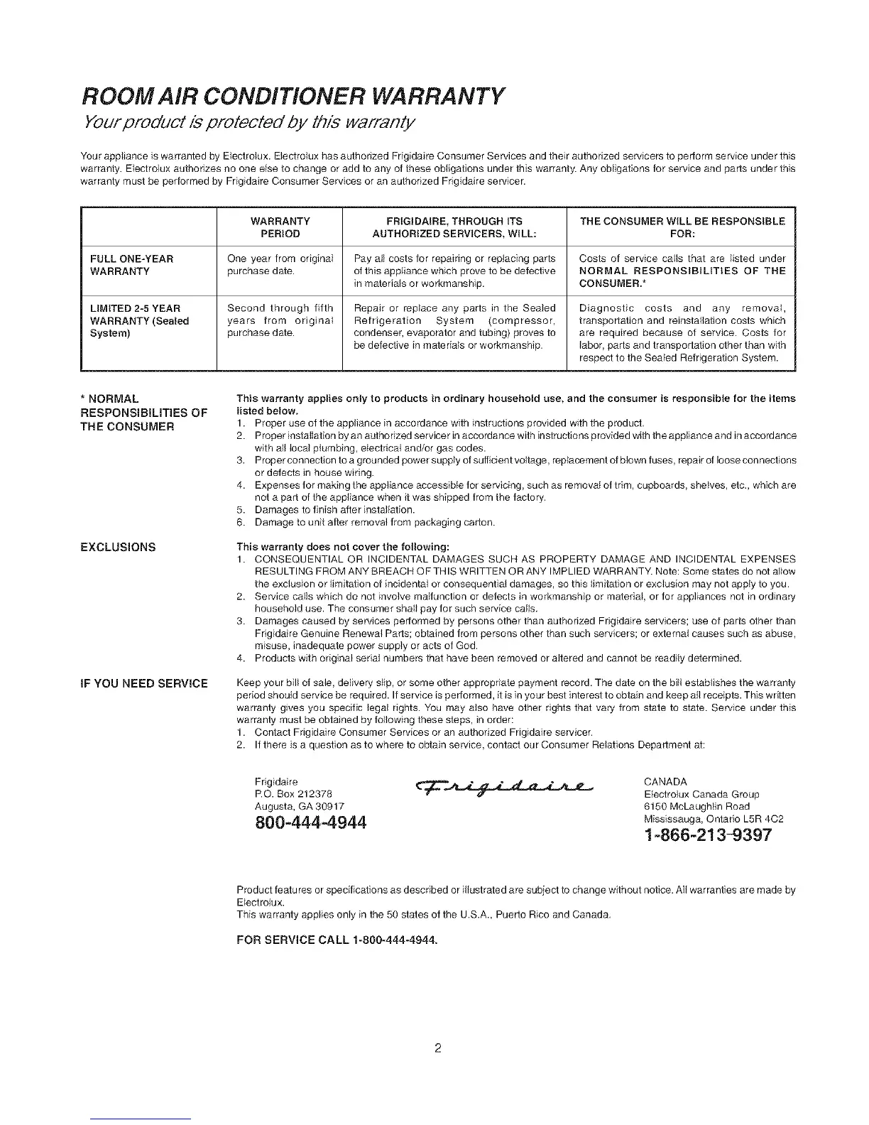 warranty must be performed by Frigidaire Consumer Services or an authorized Frigidaire servicer.
