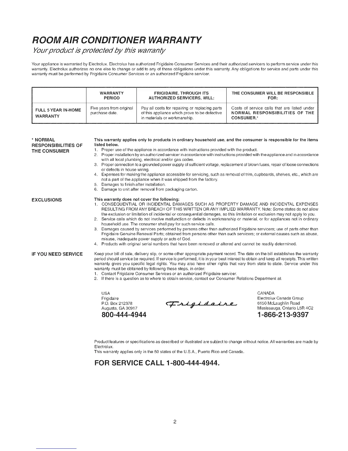 warranty must be performed by Frigidaire Consumer Services or an authorized Frigidaire servicer.