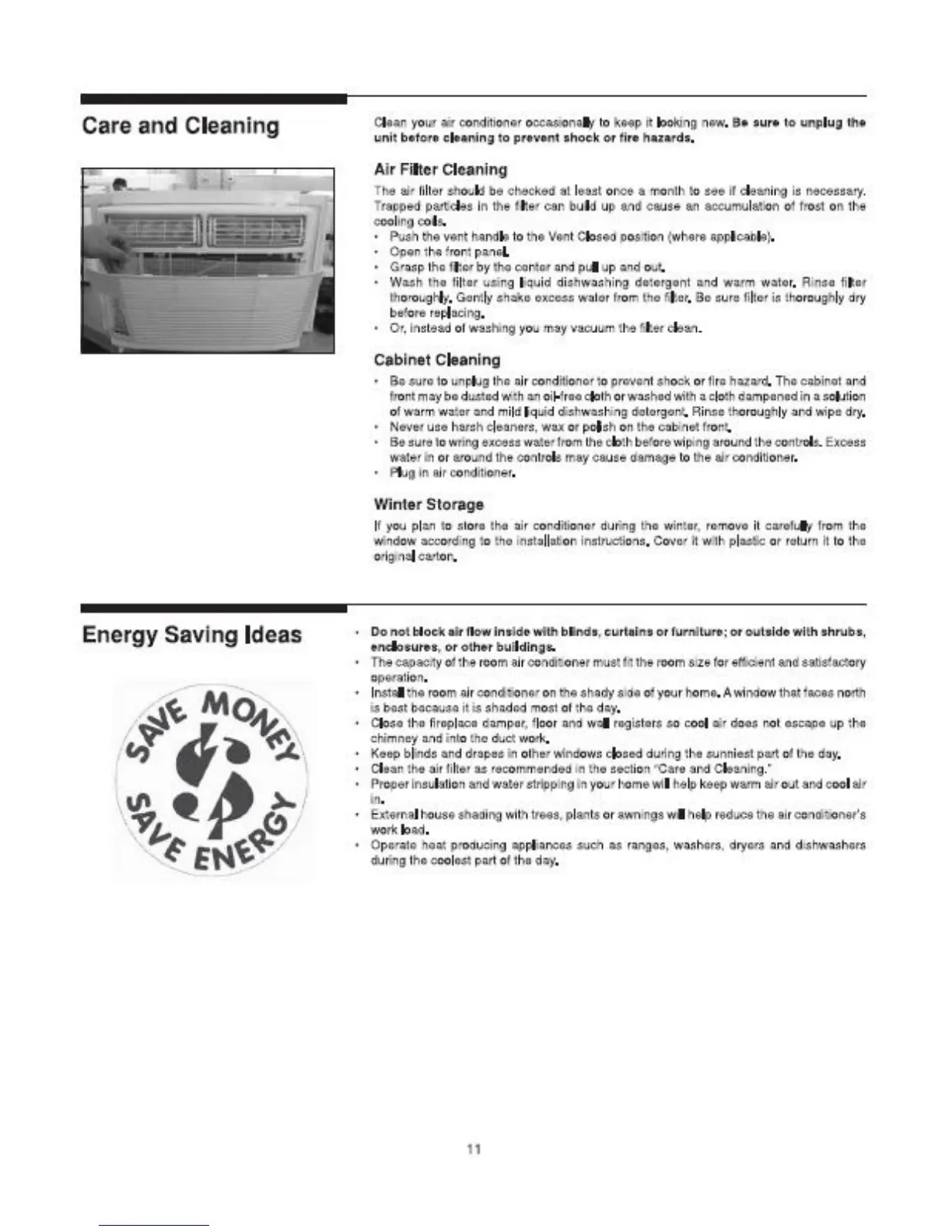 Frigidaire FAC104P1A - Care and Cleaning; Air Filter Cleaning; Cabinet Cleaning; Winter Storage