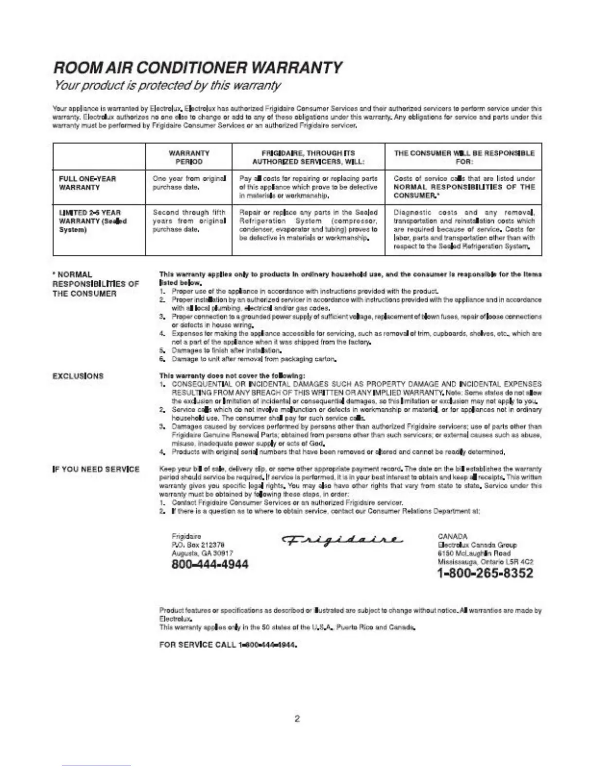 Frigidaire FAC104P1A - Room Air Conditioner Warranty; Warranty Coverage Details; Service Information