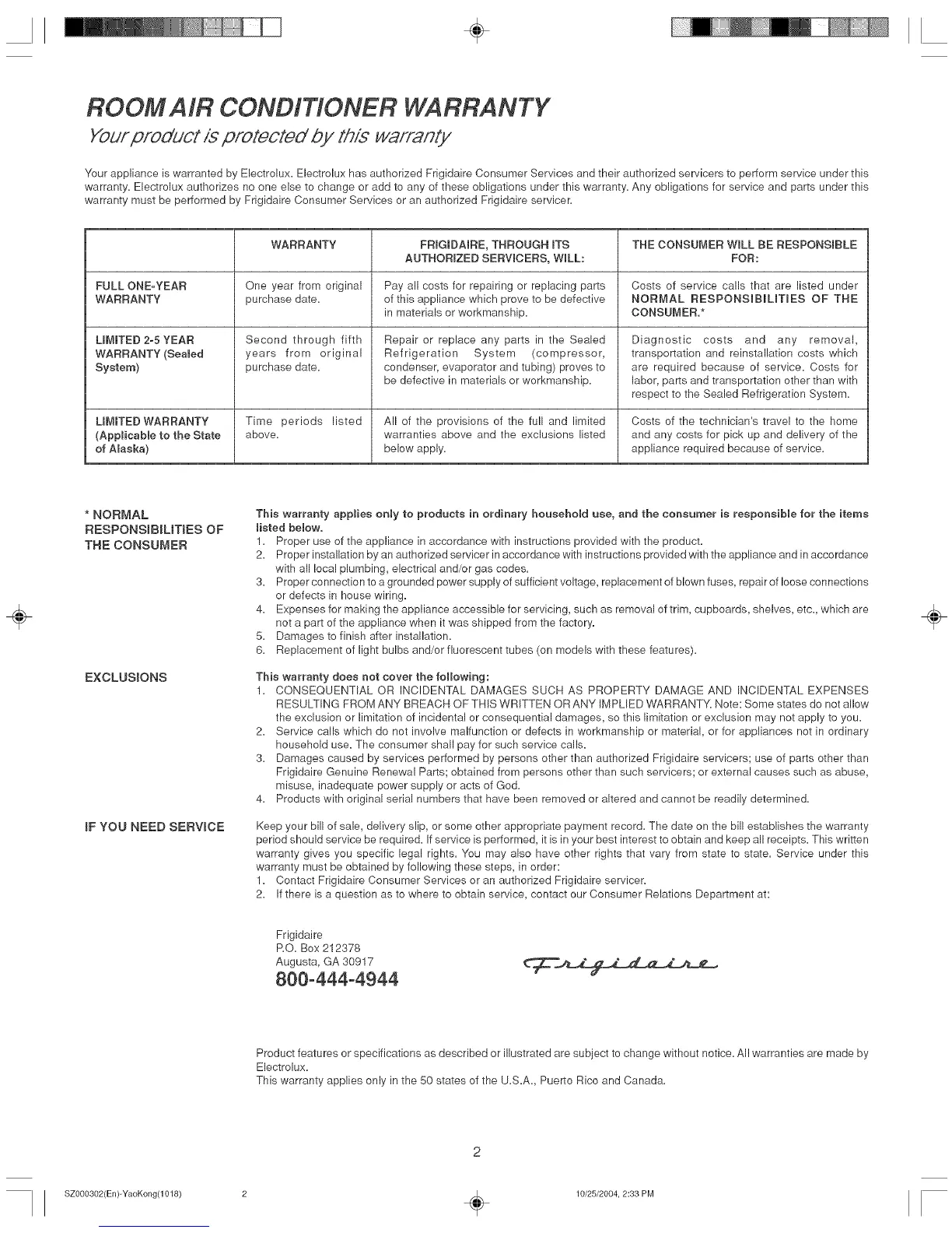warranty must be performed by Frigidaire Consumer Services or an authorized Frigidaire servicer.