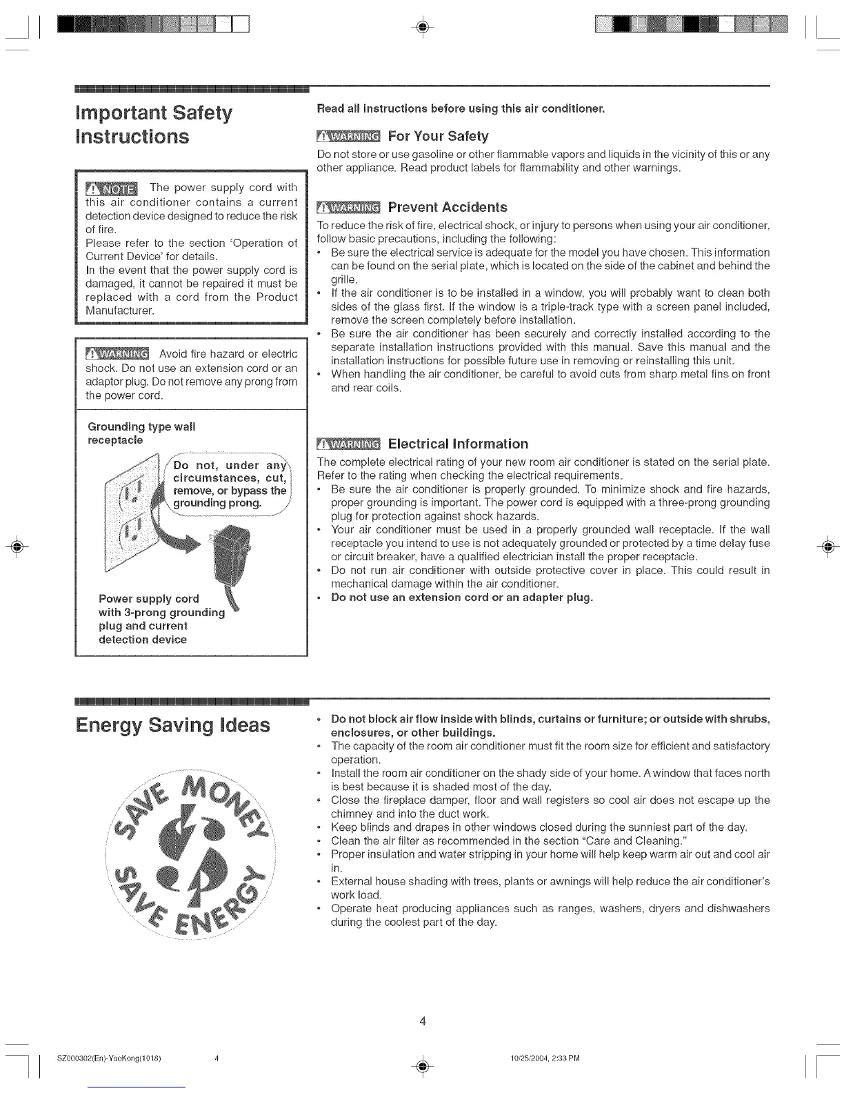 Be sure the air conditioner is properly grounded= To minimize shock and fire hazards,