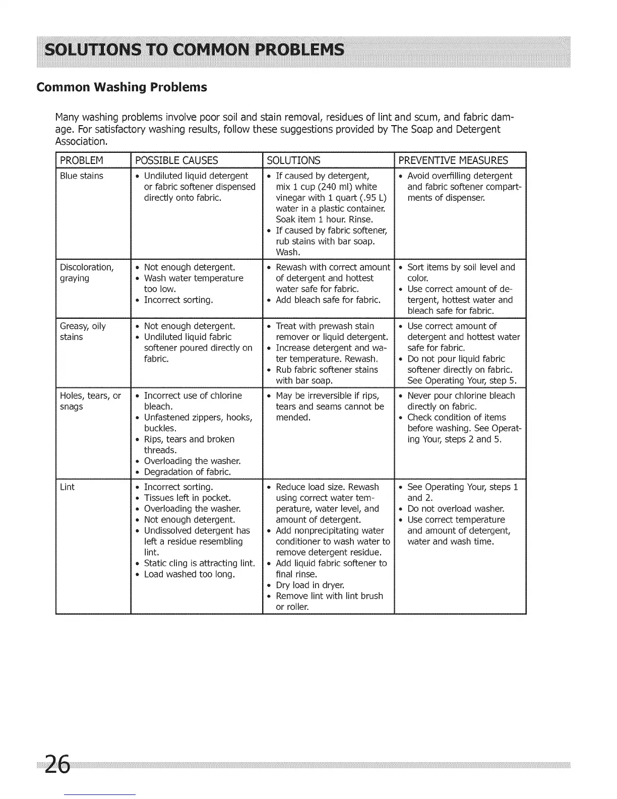 Many washing problems involve poor soil and stain removal, residues of lint and scum, and fabric dam-