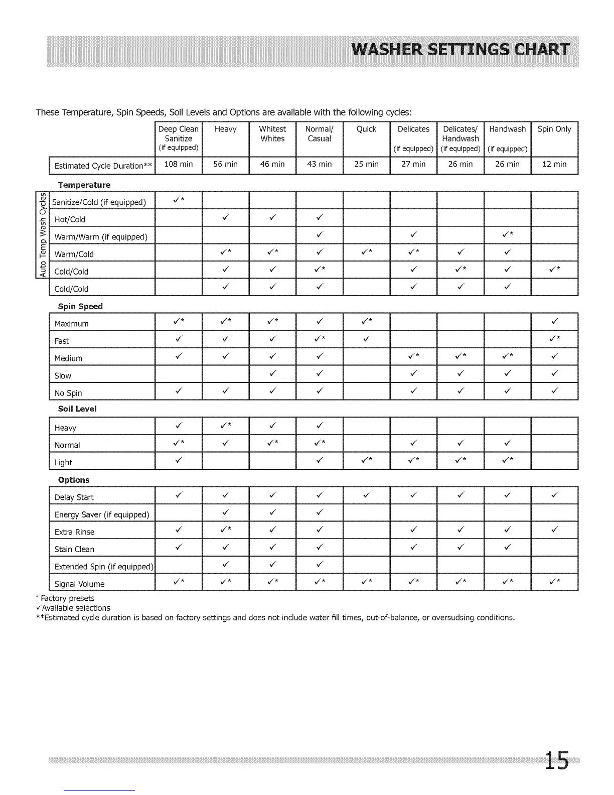 **Estimated cycle duration is based on factory settings and does not include water fill times, out-of-balance, or oversudsing conditions.