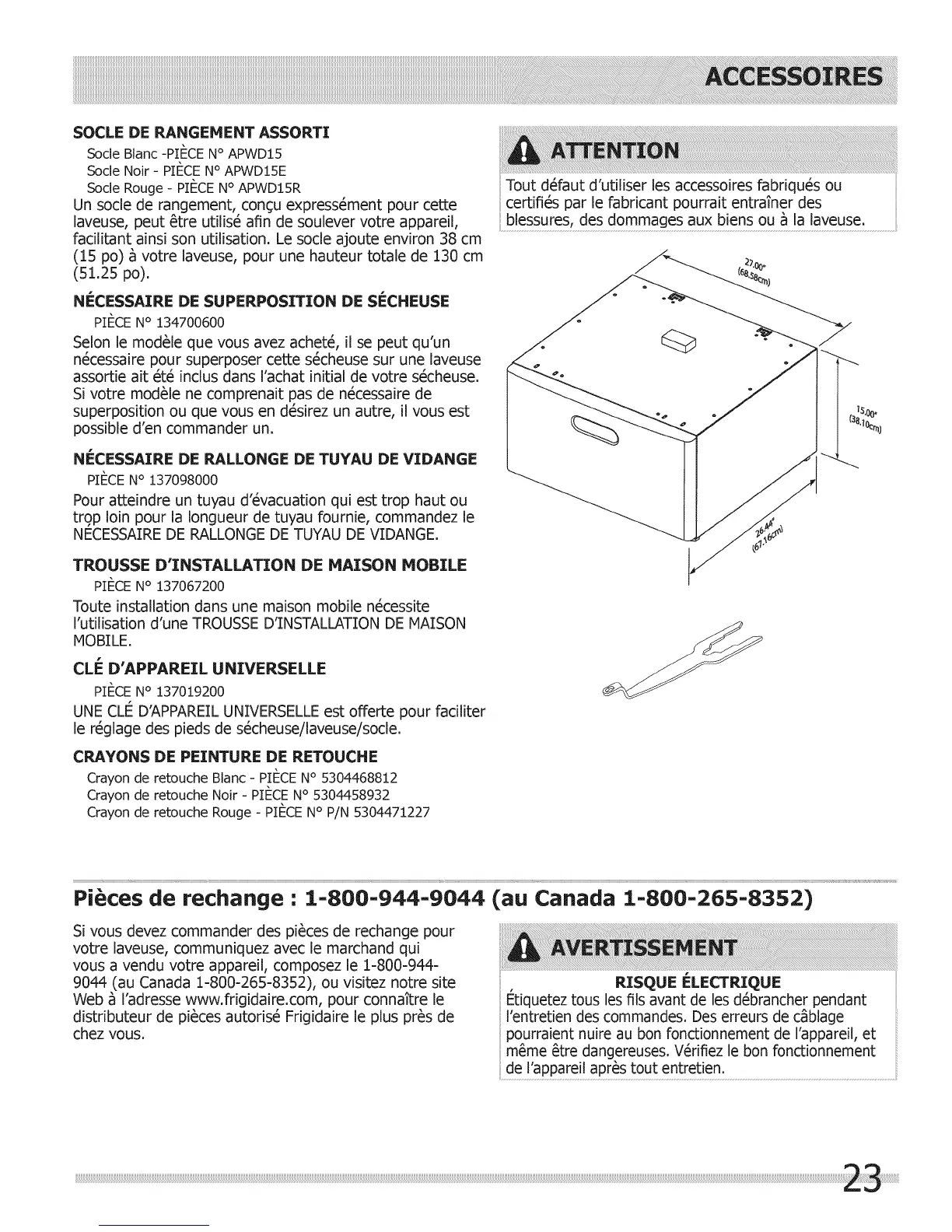 Pi ces de rechange : 1=800=944-9044 (au Canada 1=800=265=8352)