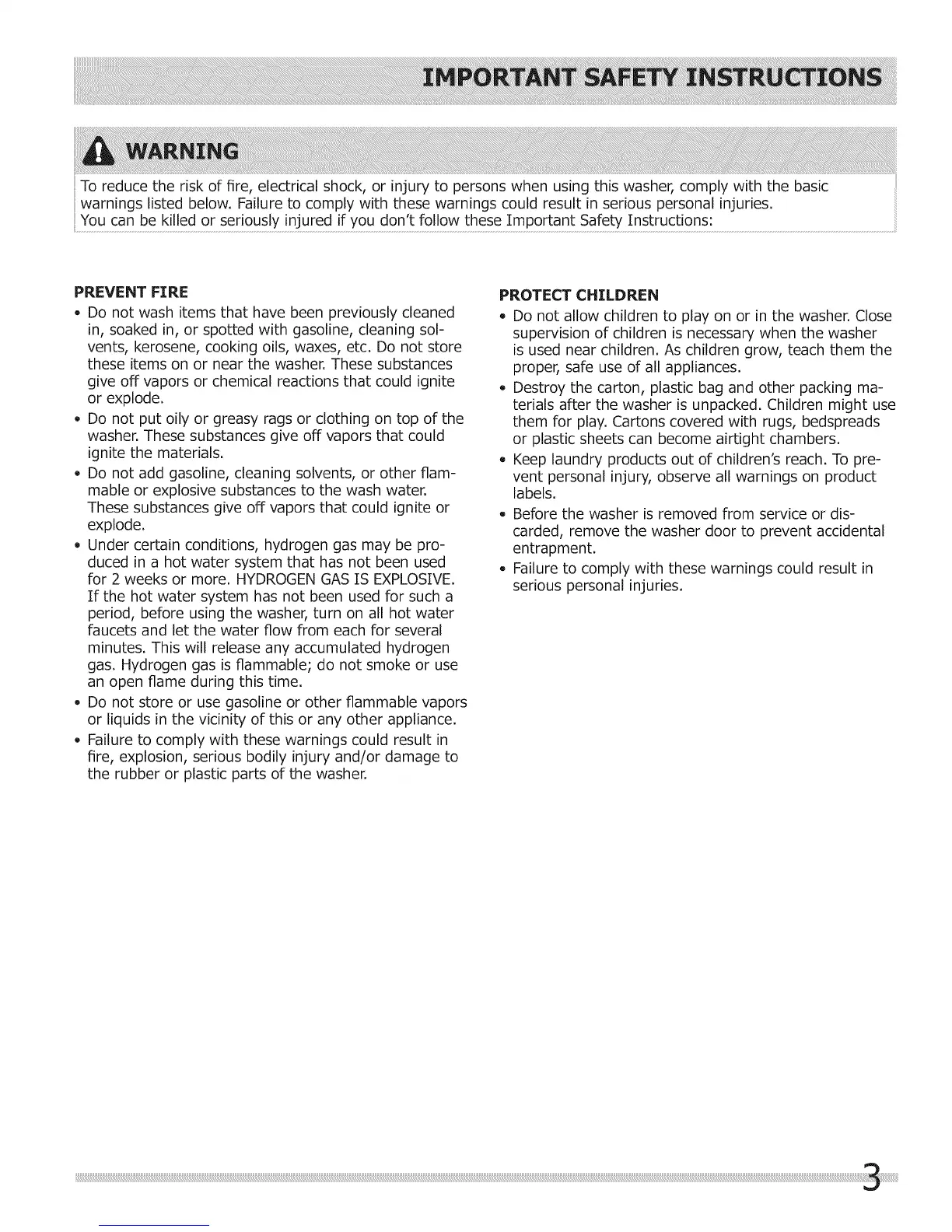 To reduce the risk of fire, electrical shock, or injury to persons when using this washer, comply with the basic