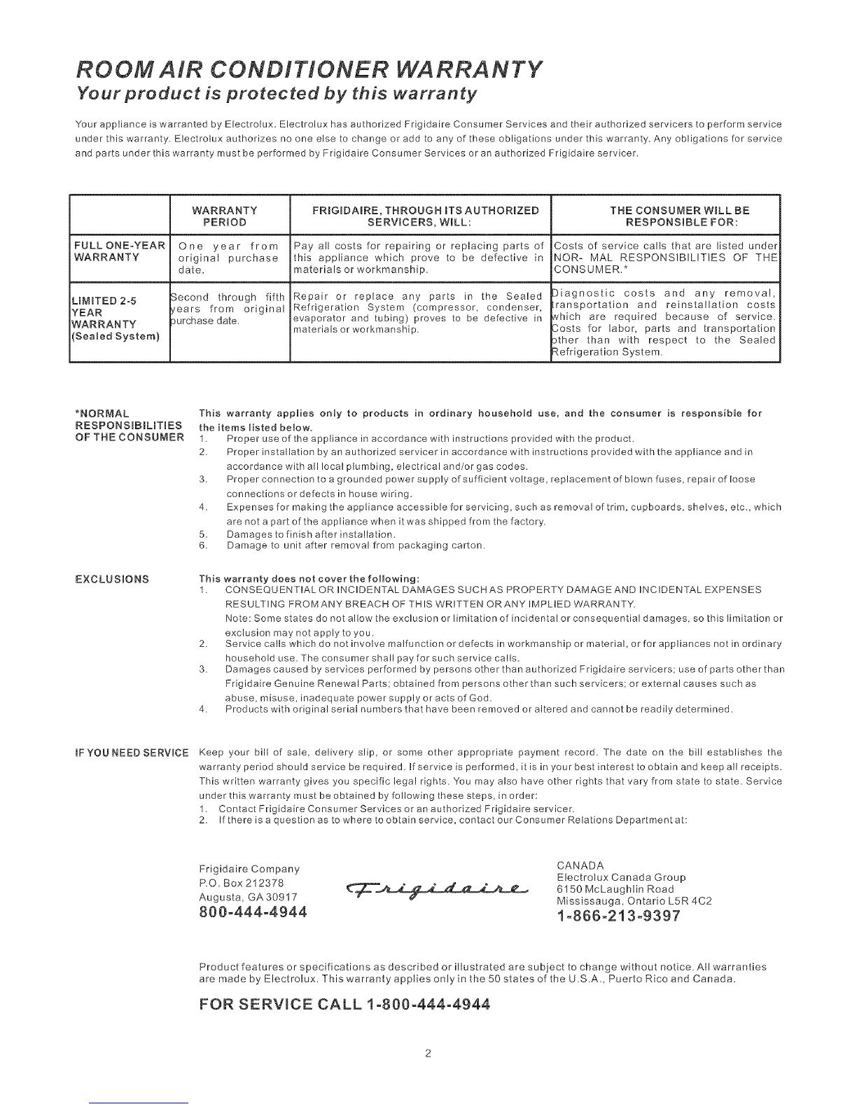 WARRANTY FRIGIDAIRE, THROUGH RTSAUTHORIZED THE CONSUMER WILL BE