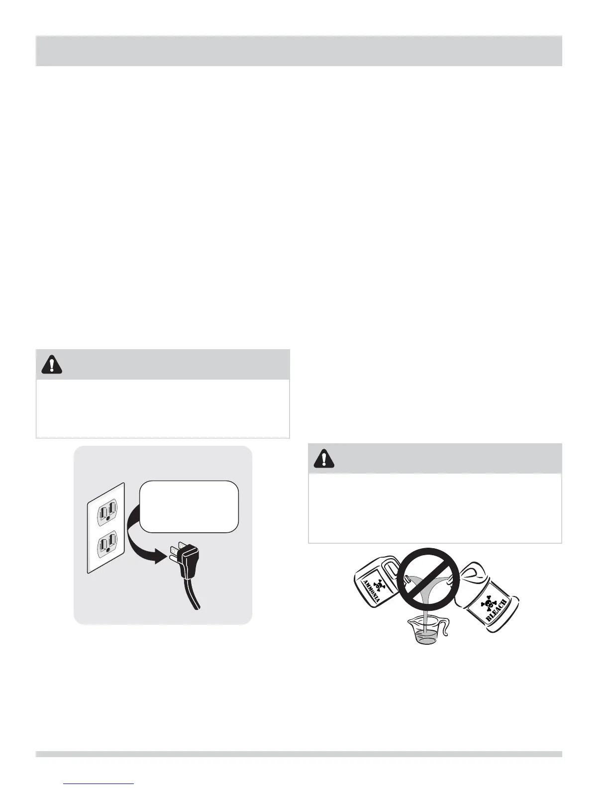 • Do not mix chlorine bleach with ammonia or acids such