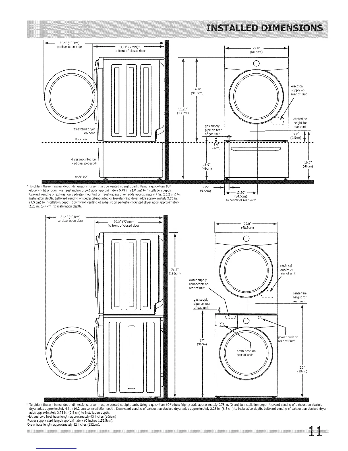 installation depth. Leftward venting on pedestaFmounted or freestanding dryer adds approximately 3.75 in.