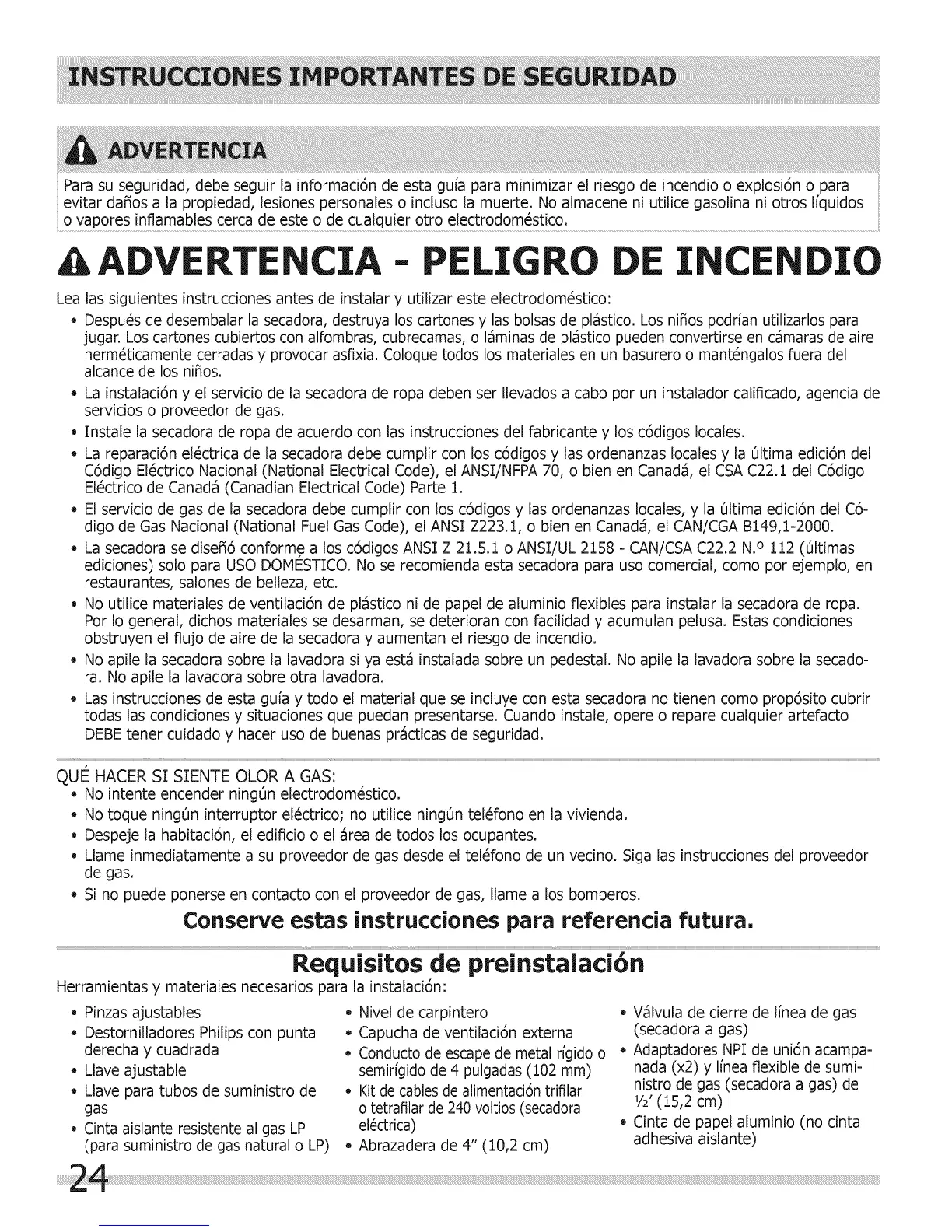 - El servicio de gas de la secadora debe cumplir con los c6digos y las ordenanzas locales, y la L_ltimaedici6n del C6-