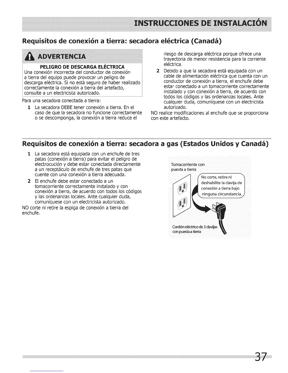 1 La secadora DEBE tener conexi6n a tierra. En el