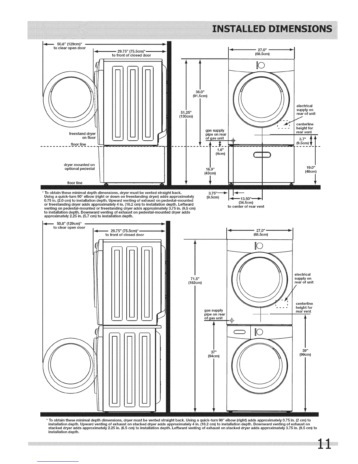 venting on pedestal-mounted or freestanding dryer adds approximately 3.75 in. (9.5 cm}
