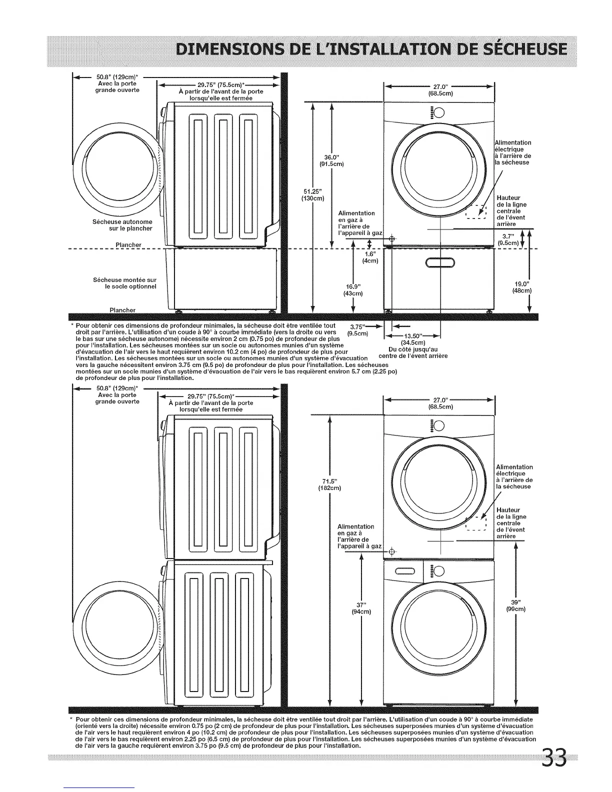 de I'air vers le haut requi_rent environ 4 po (t0.2 crn) de profondeur de plus pour I'installation. Les secheuses superpos_es rnunies d'un syst_rne d'evacuation