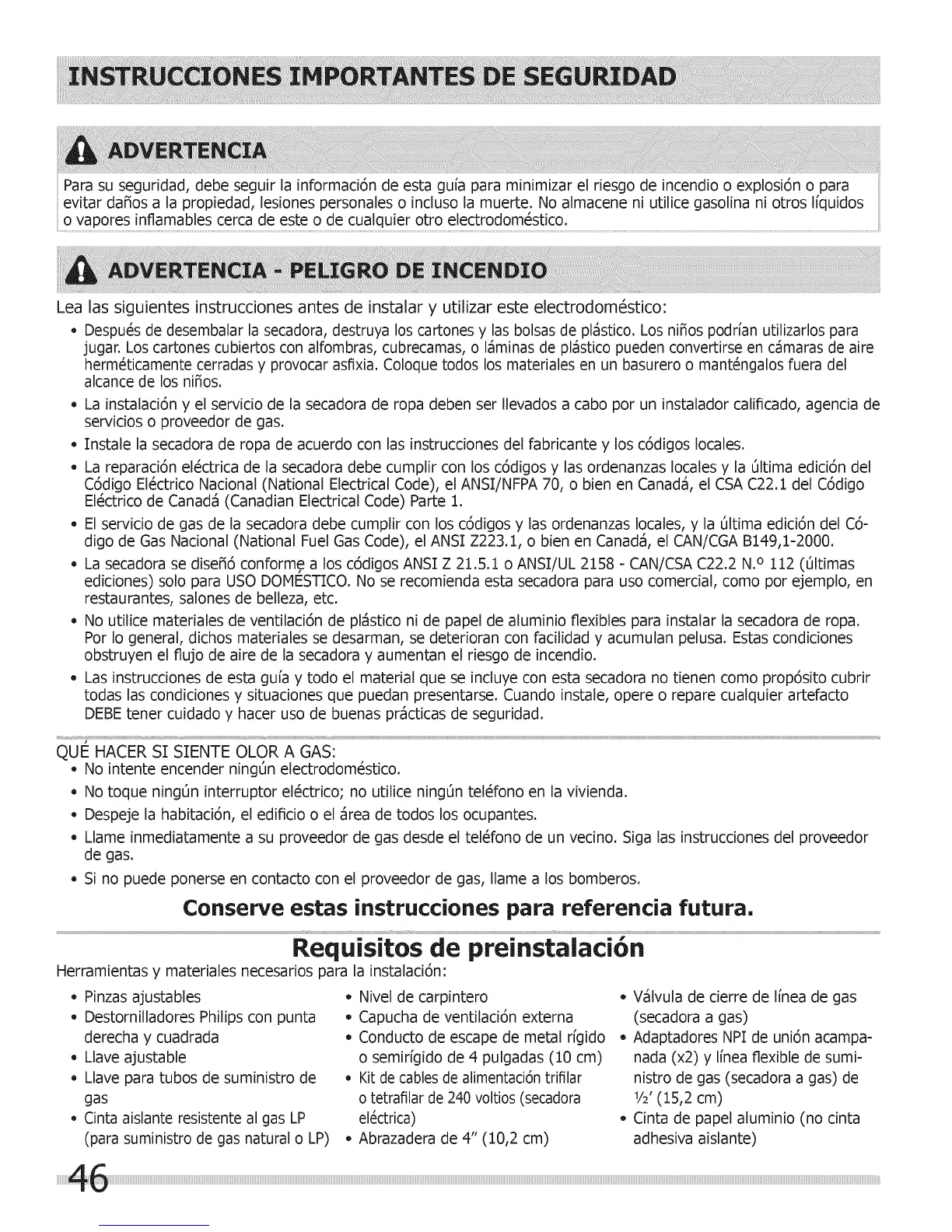 - El servicio de gas de la secadora debe cumplir con los c6digos y las ordenanzas locales, y la 01tima edici6n del C6-