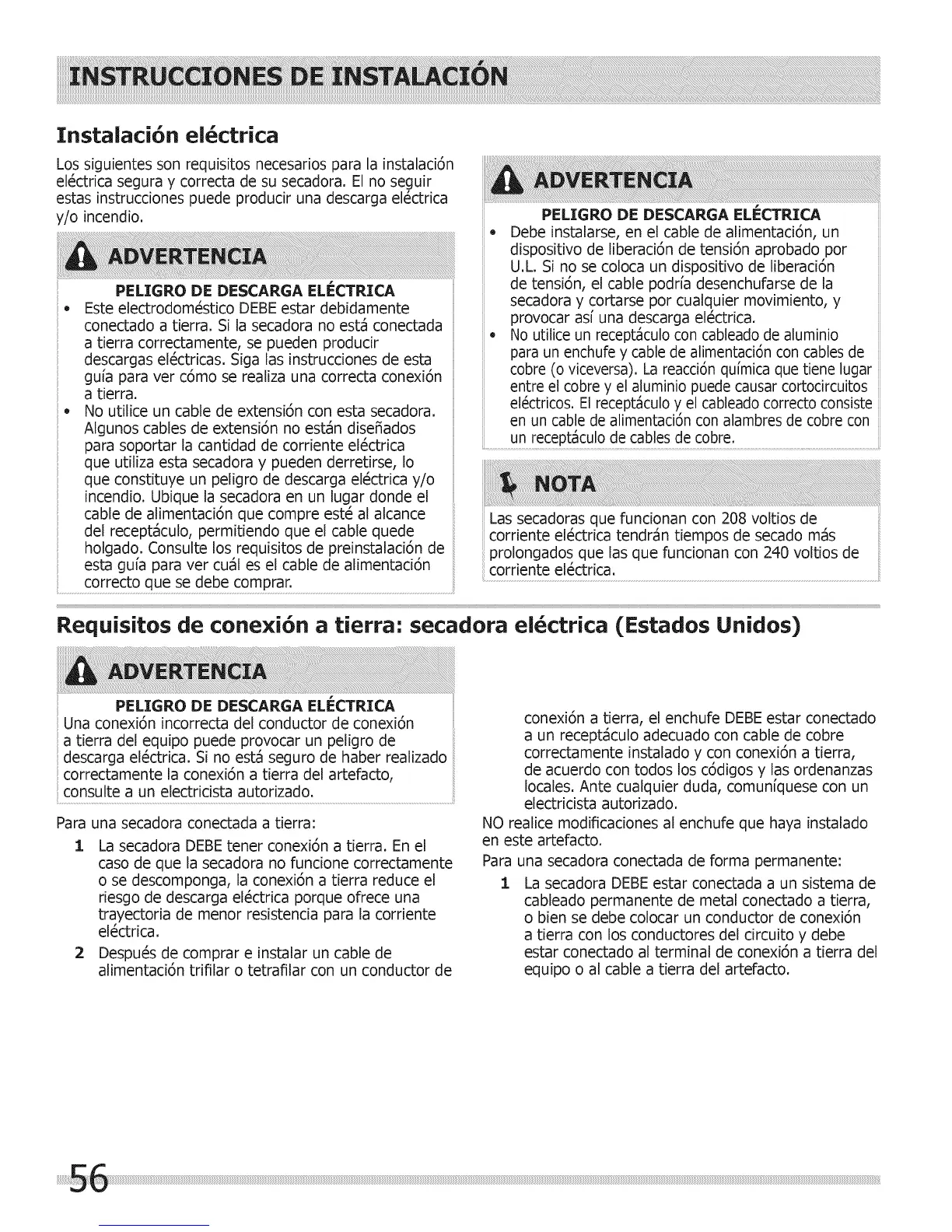Requisitos de conexi6n a tierra: secadora ei ctrica (Estados Unidos)