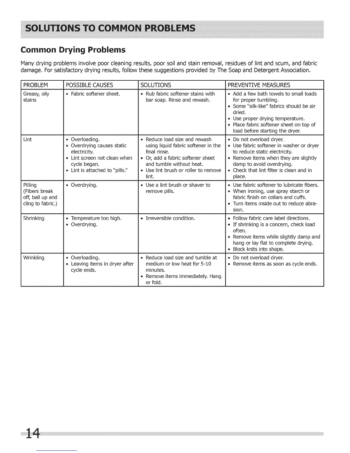 Many drying problems involve poor cleaning results, poor soil and stain removal, residues of lint and scum, and fabric